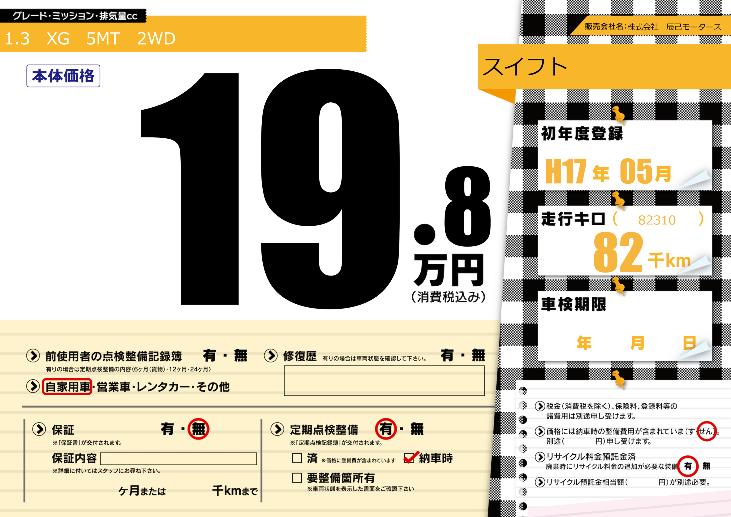 | 車名 | スイフト | グレード ミッション 排気量 |