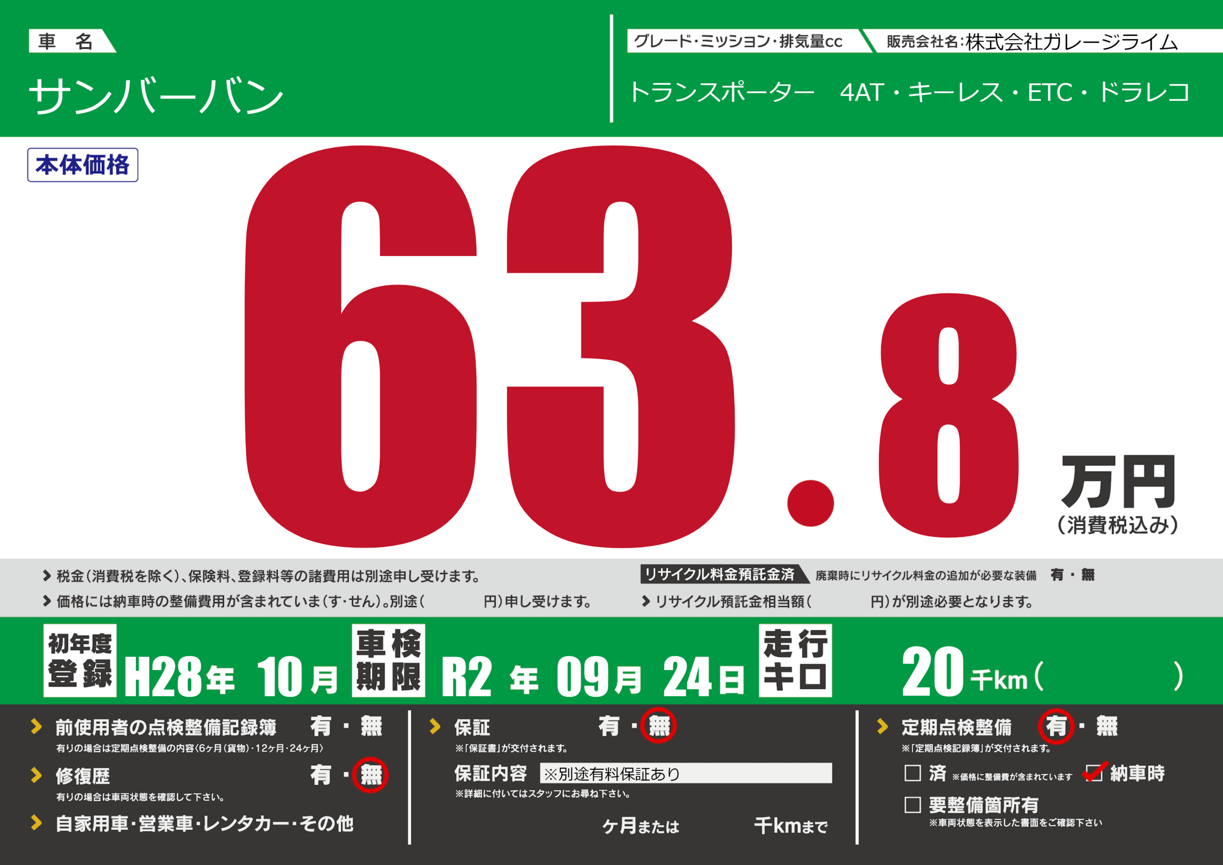保証なし 保証内容(※別途有料保証あり) ---ヶ月または()千kmまで |