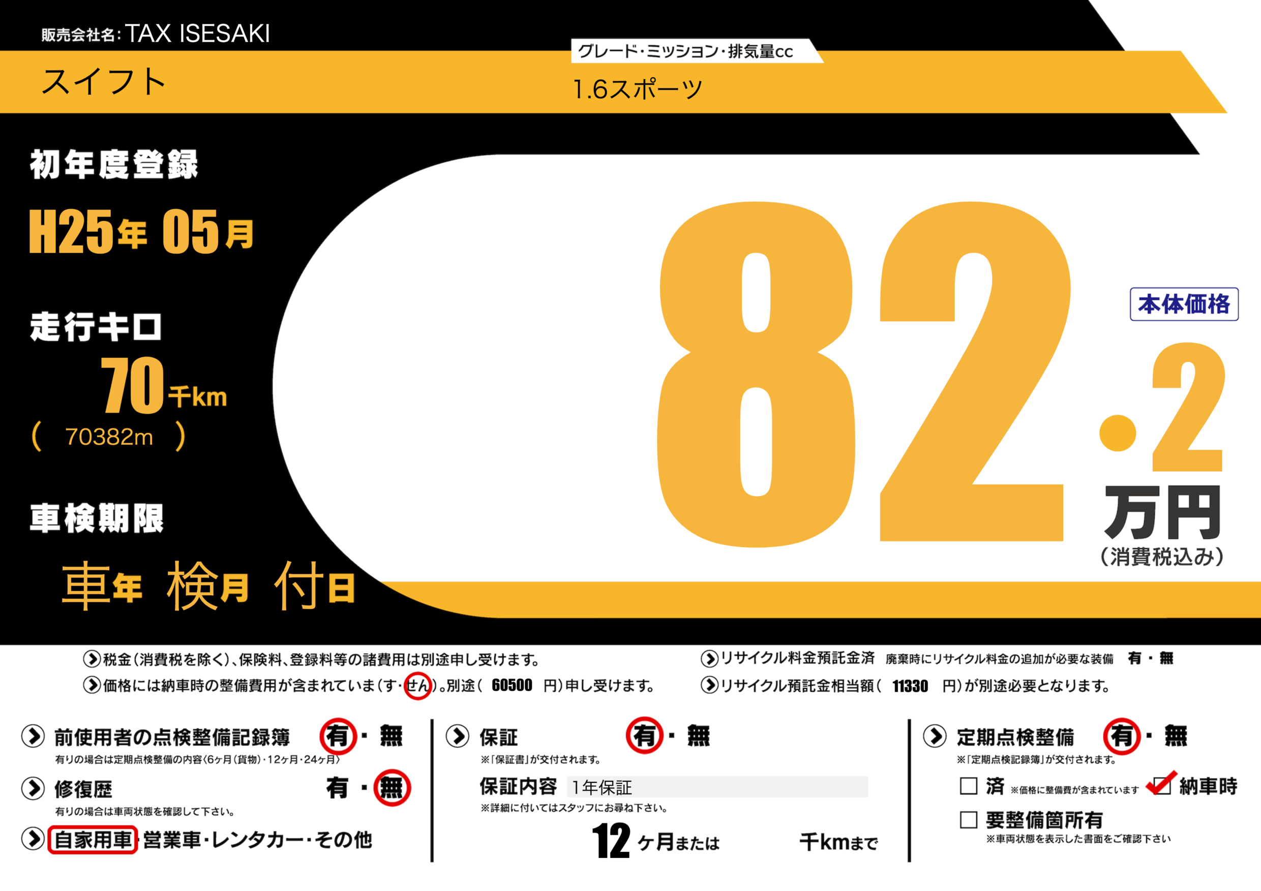 | 車名 | スイフト | グレード ミッション 排気量 |