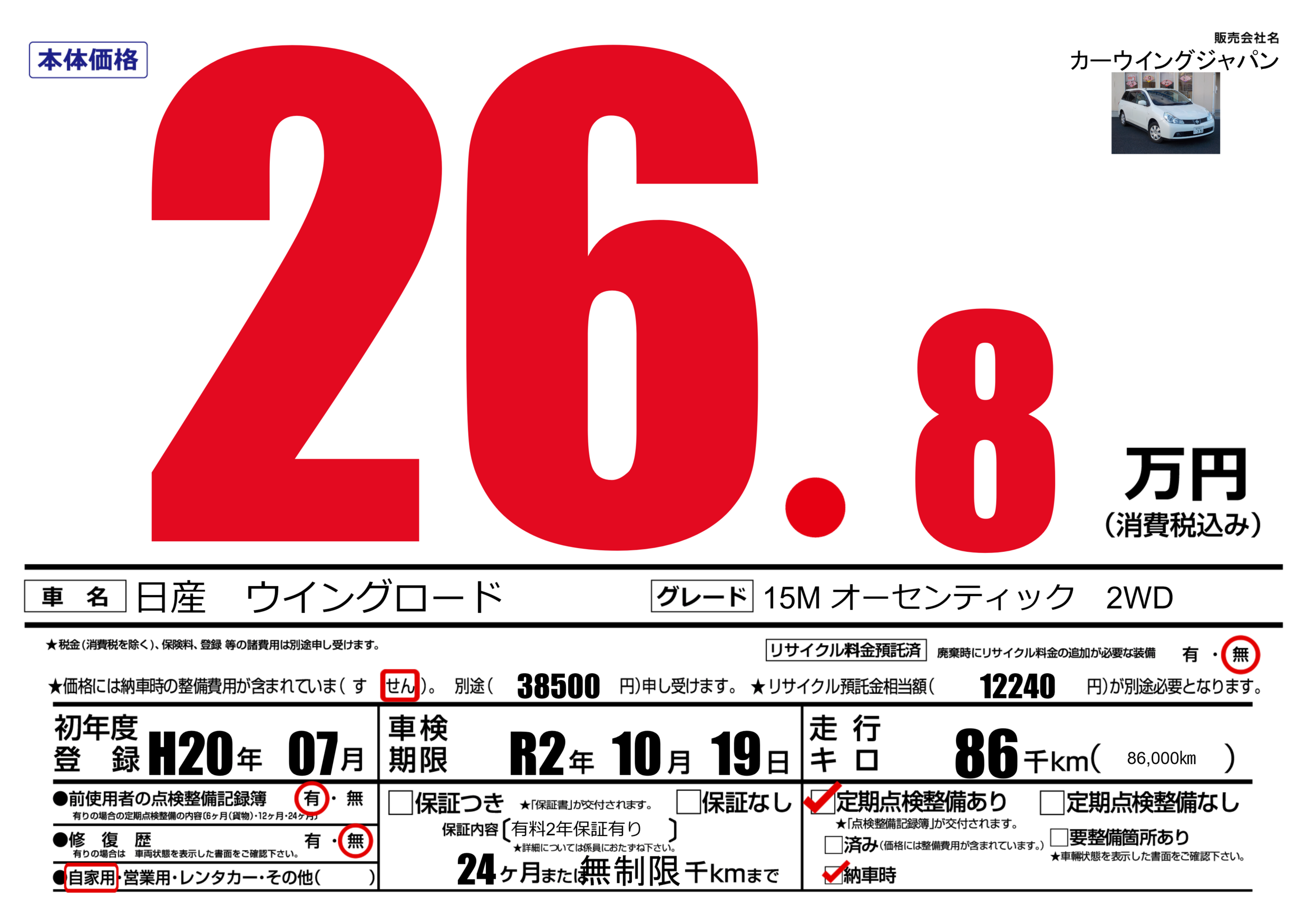 | 車名 | 日産 ウイングロード | グレード ミッション 排気量 |