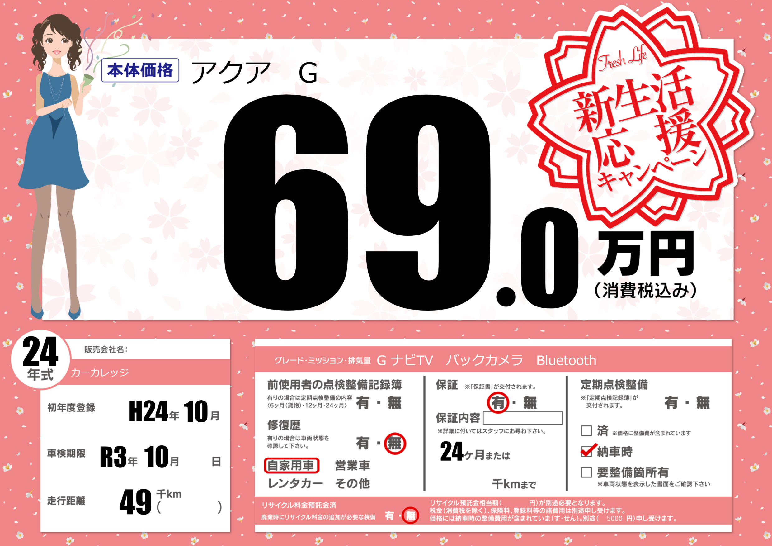 | 車名 | アクア G | グレード ミッション 排気量 |