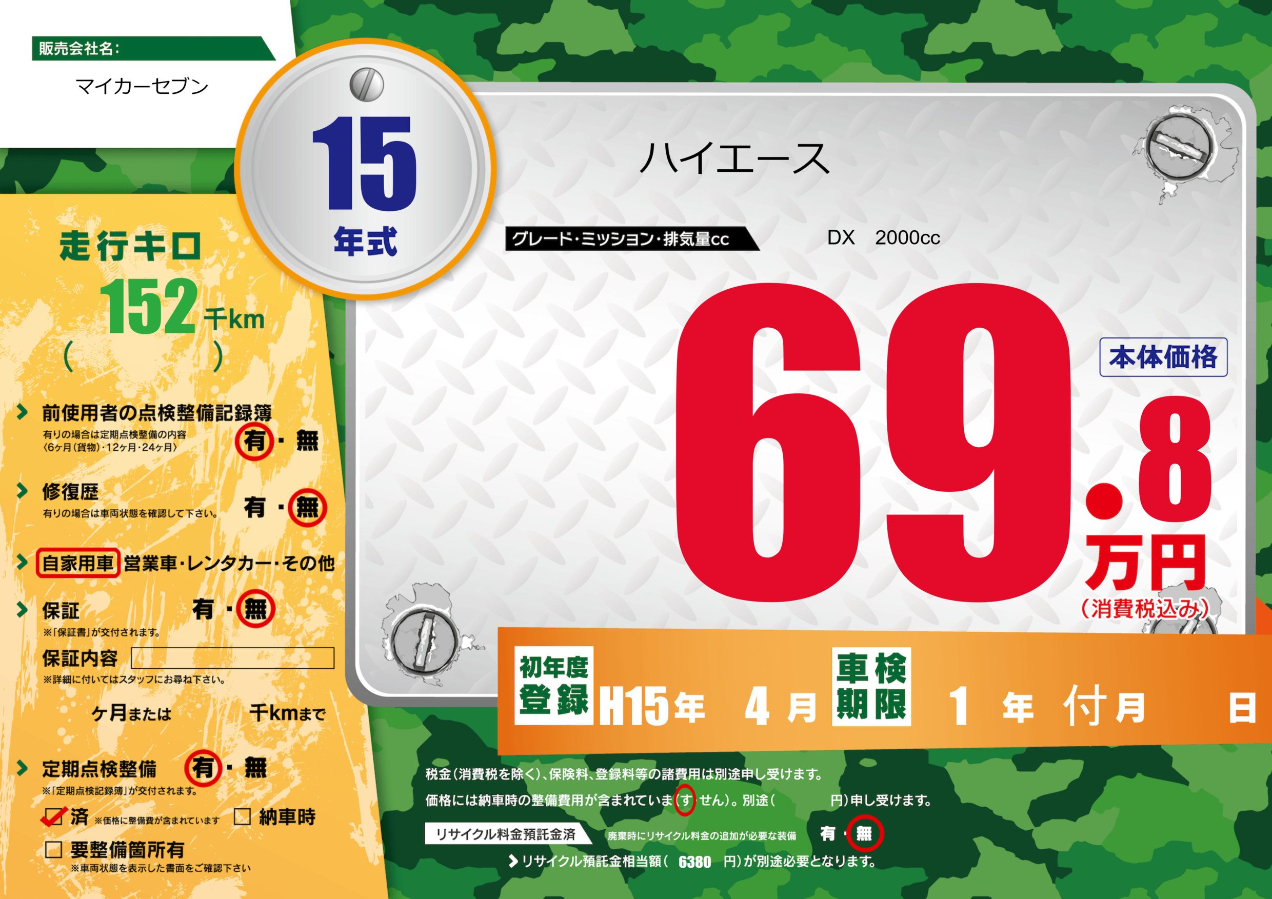 | 定期点検整備 | 定期点検整備あり 定期点検整備済み | ||