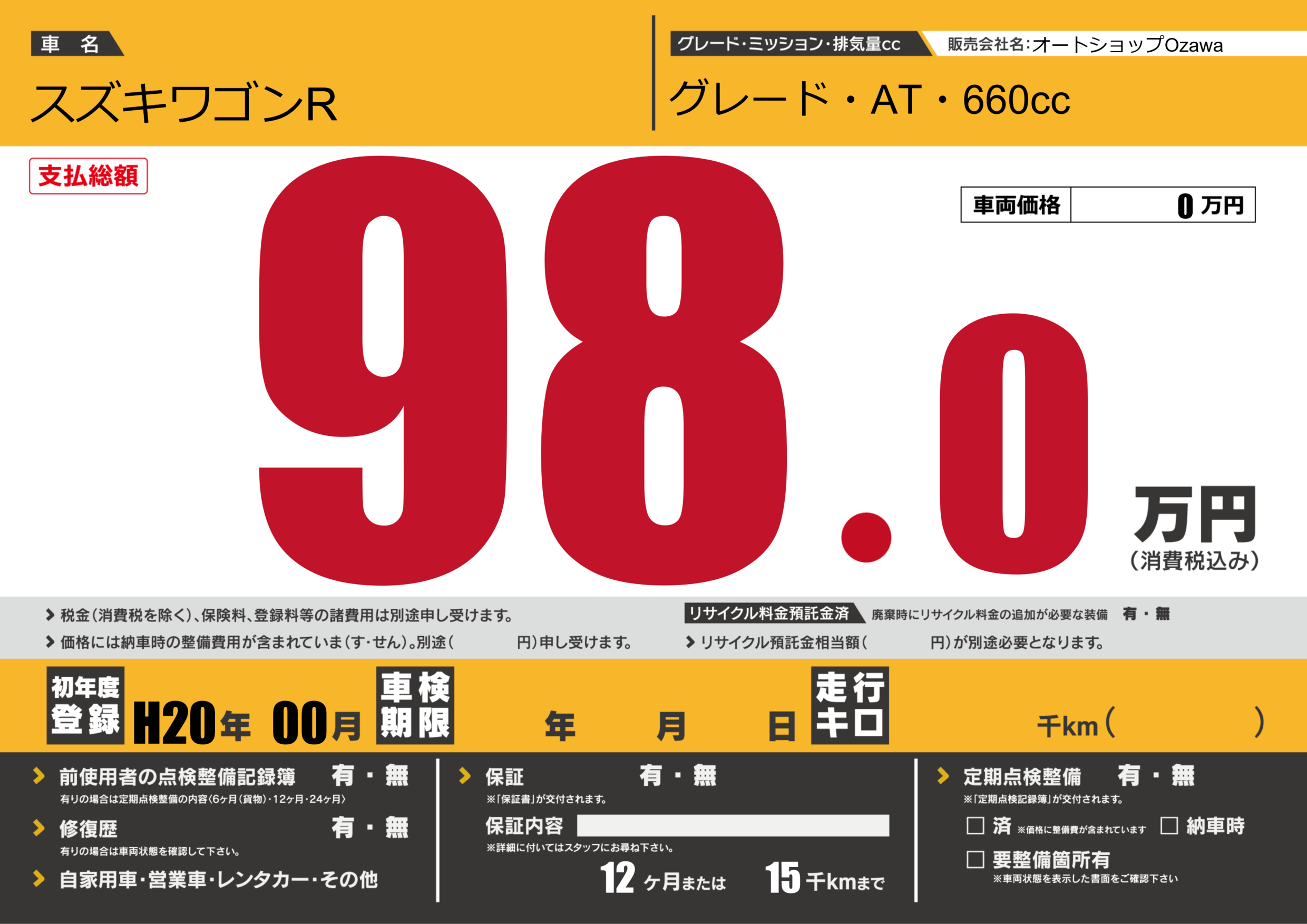 | 車名 | スズキワゴンR | グレード ミッション 排気量 |