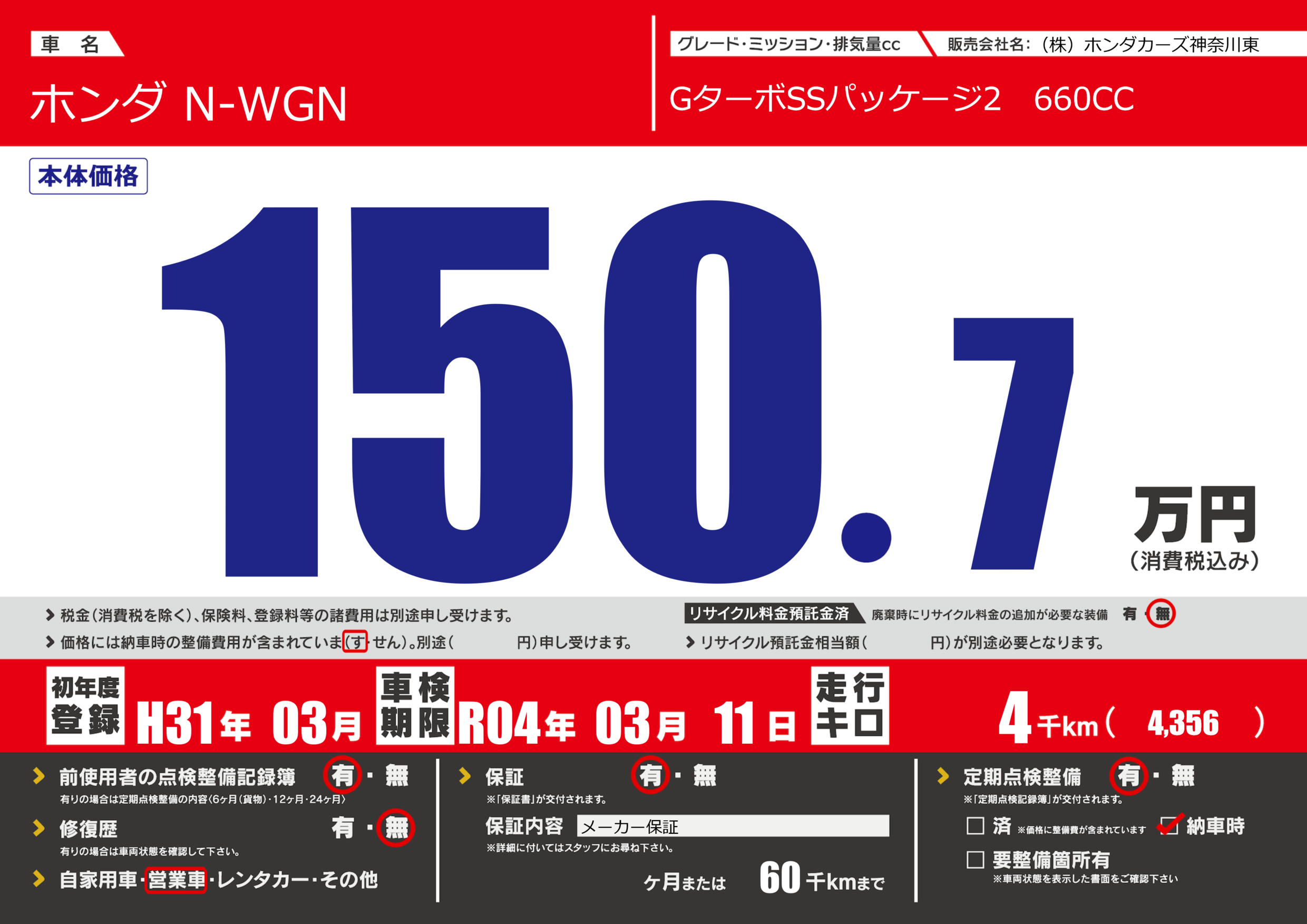 | 車名 | ホンダ N-WGN | グレード ミッション 排気量 |