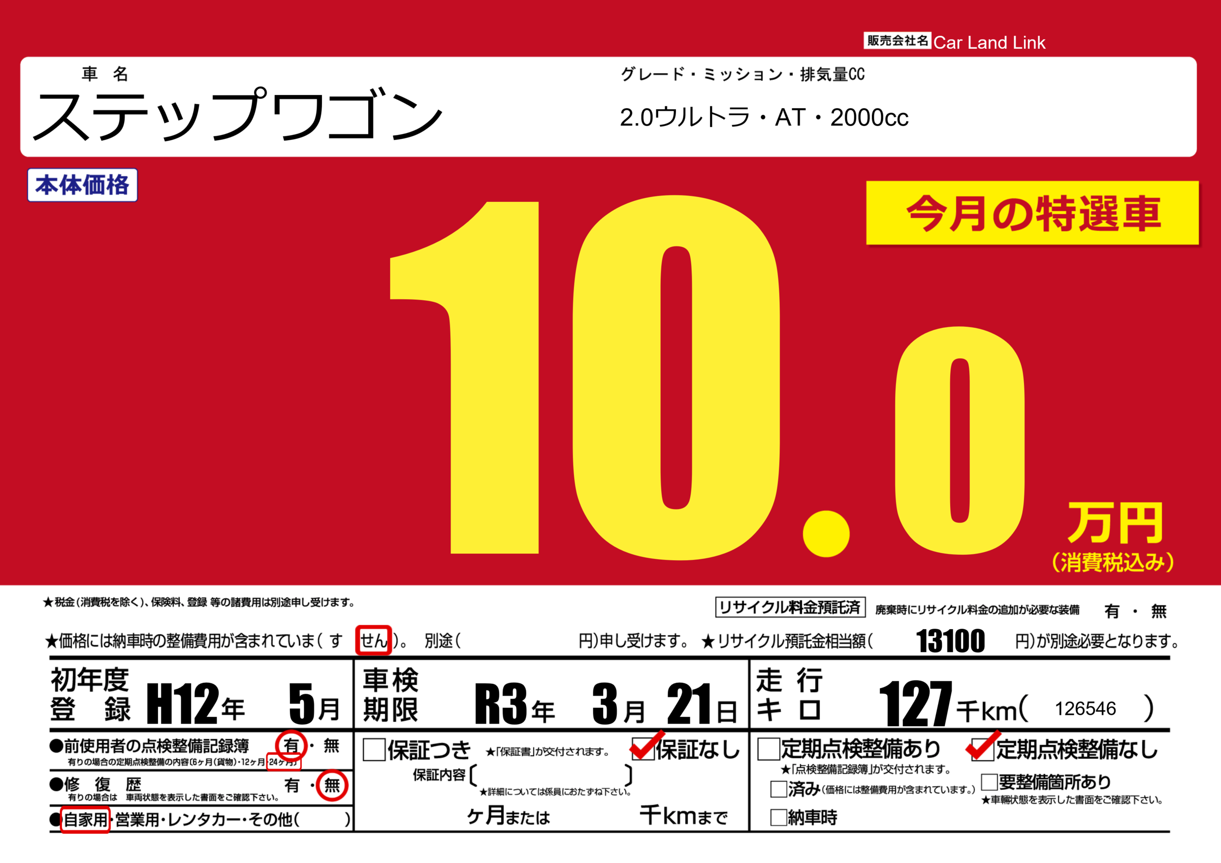 | 走行キロ | 12.7万km | 初年度登録 | H12年5月 |