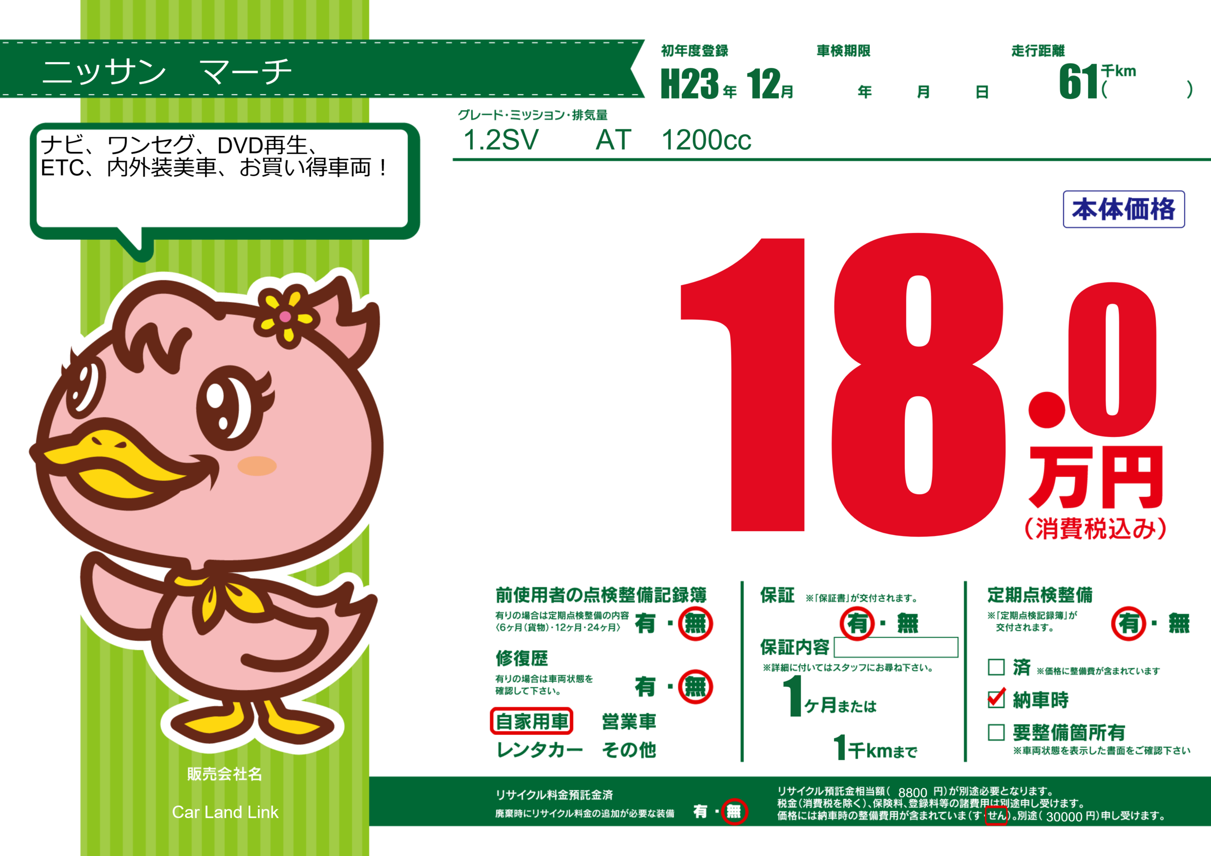 | 車名 | ニッサン マーチ | グレード ミッション 排気量 |
