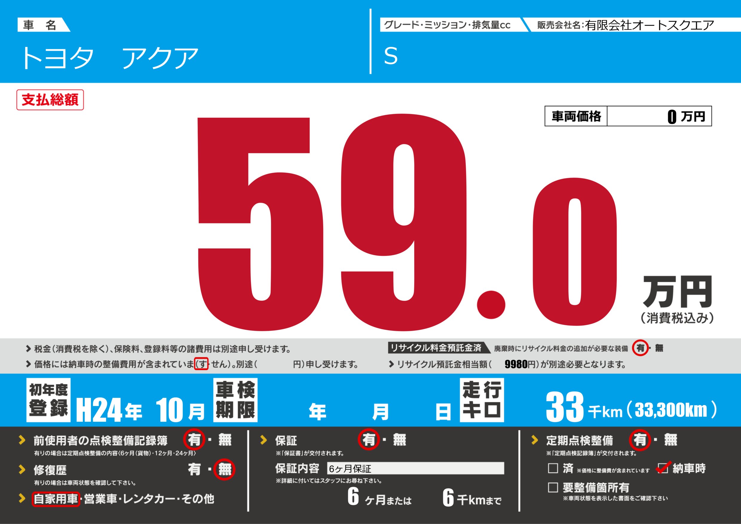 | 車名 | トヨタ アクア | グレード ミッション 排気量 |