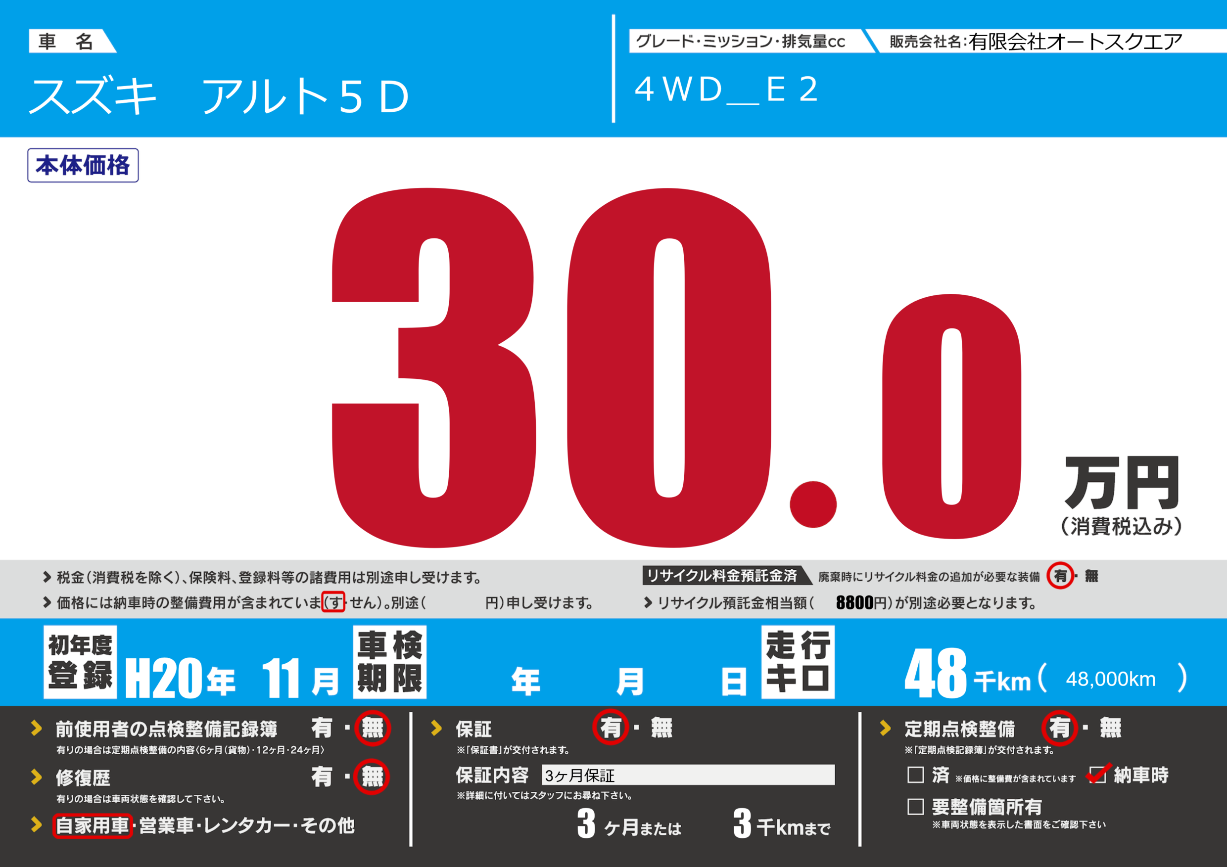 | 車名 | スズキ アルト5D | グレード ミッション 排気量 |