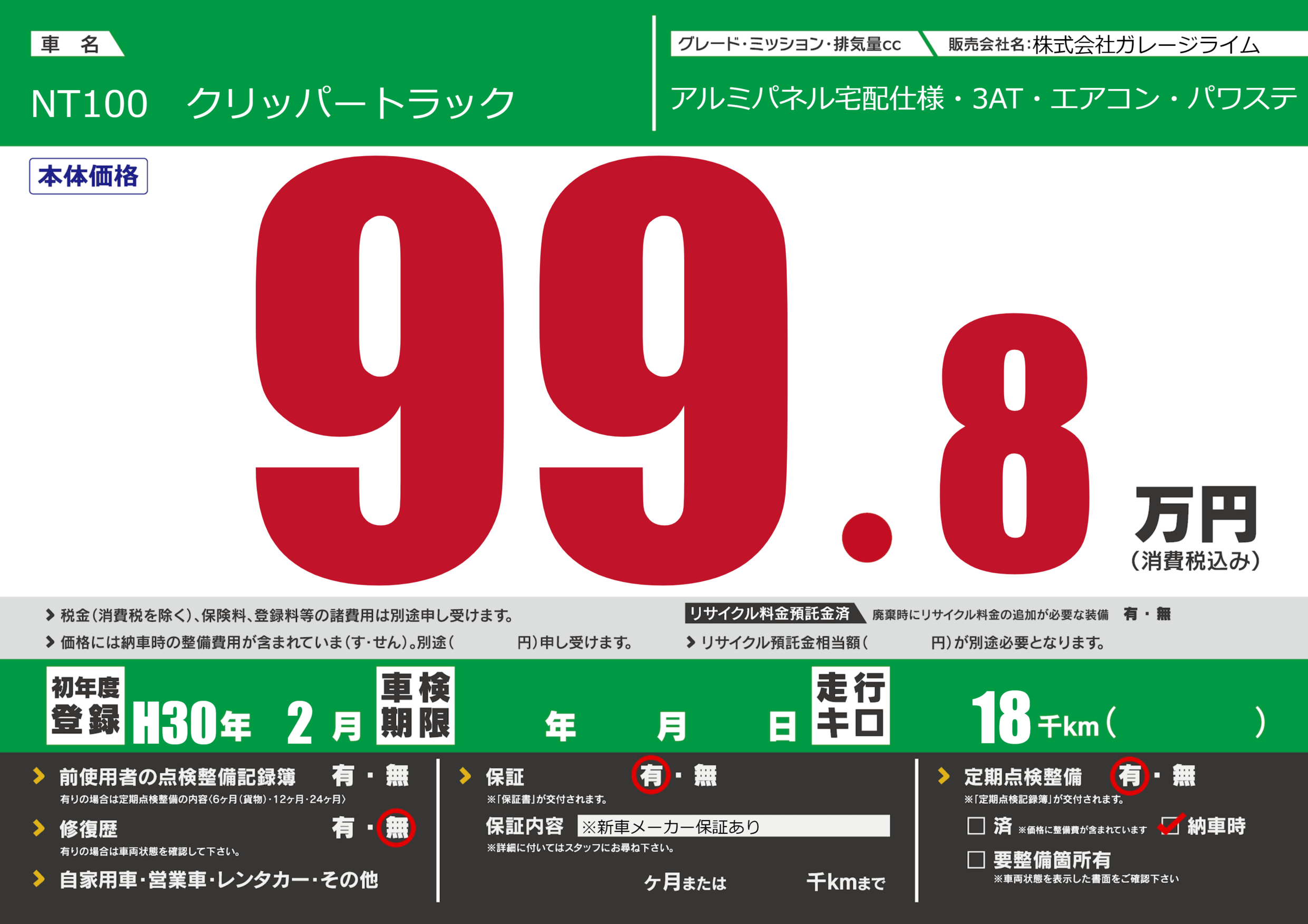 | 定期点検整備 | 定期点検整備あり 納車時あり | ||