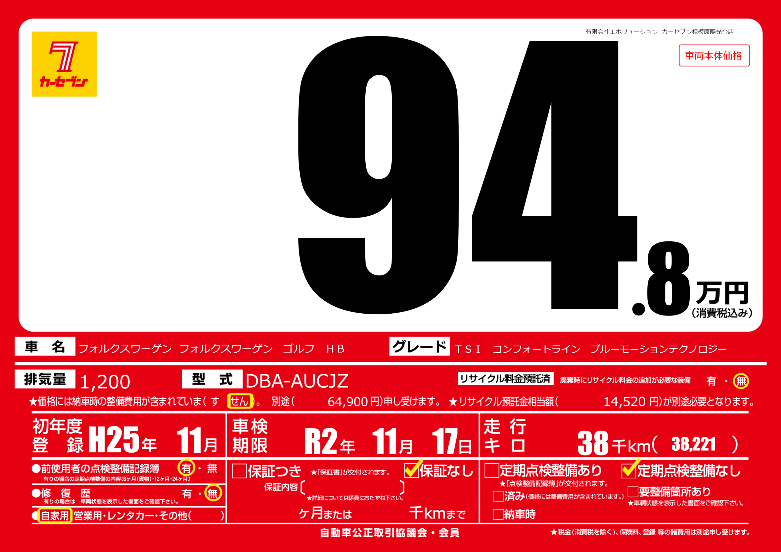 | 車名 | フォルクスワーゲン フォルクスワーゲン ゴルフ HB | グレード ミッション 排気量 |