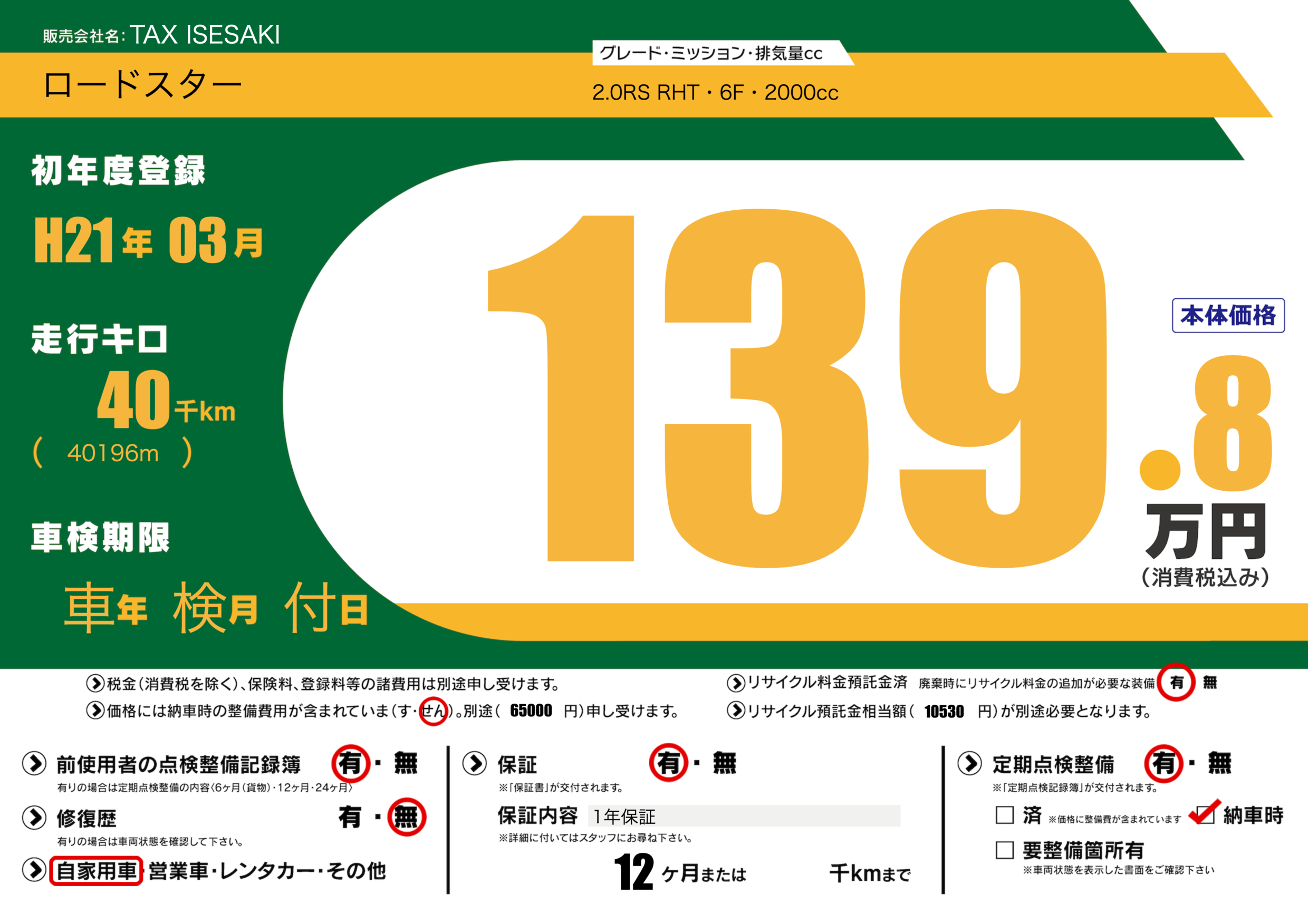 | 車名 | ロードスター | グレード ミッション 排気量 |