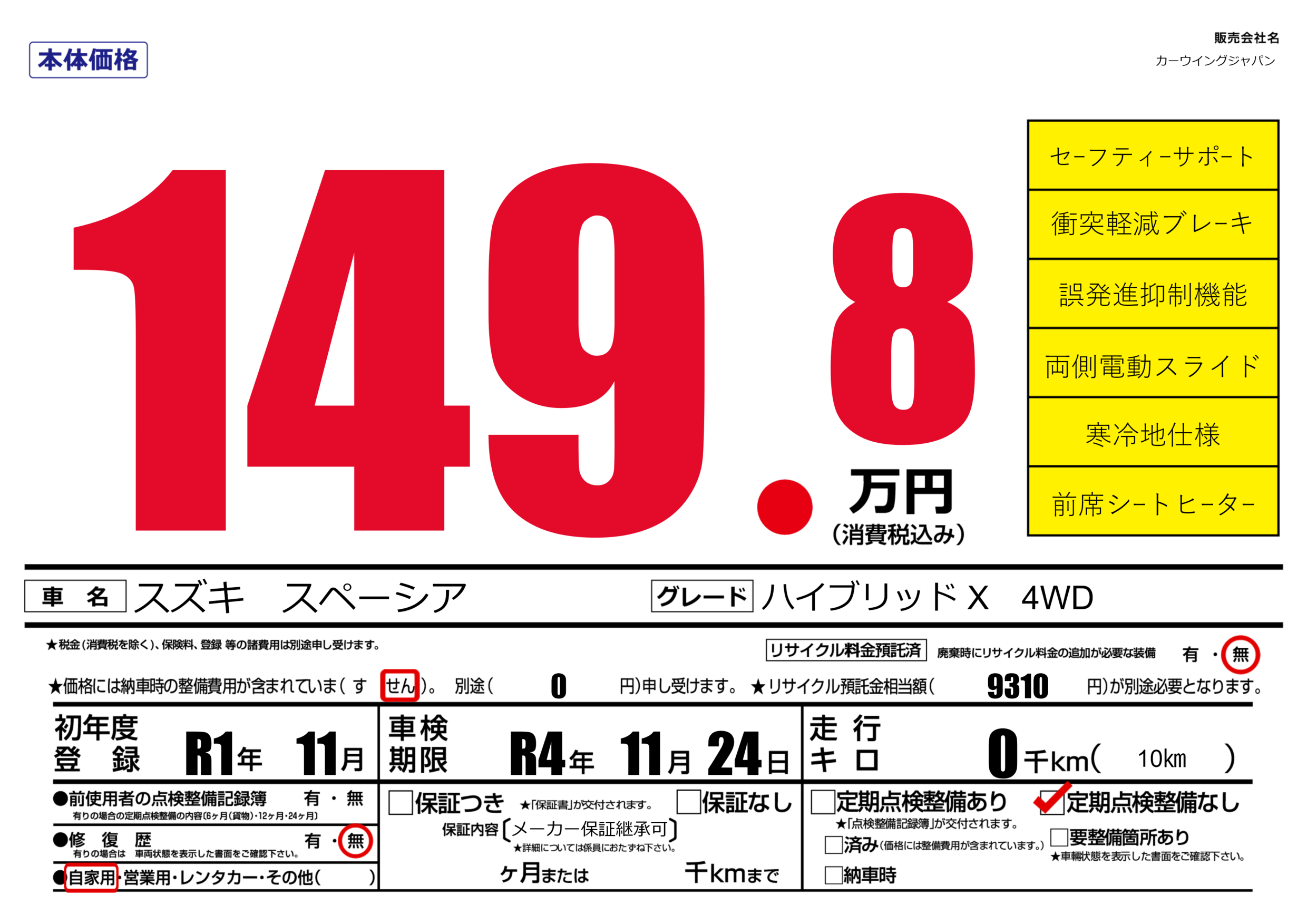 | 車名 | スズキ スペーシア | グレード ミッション 排気量 |