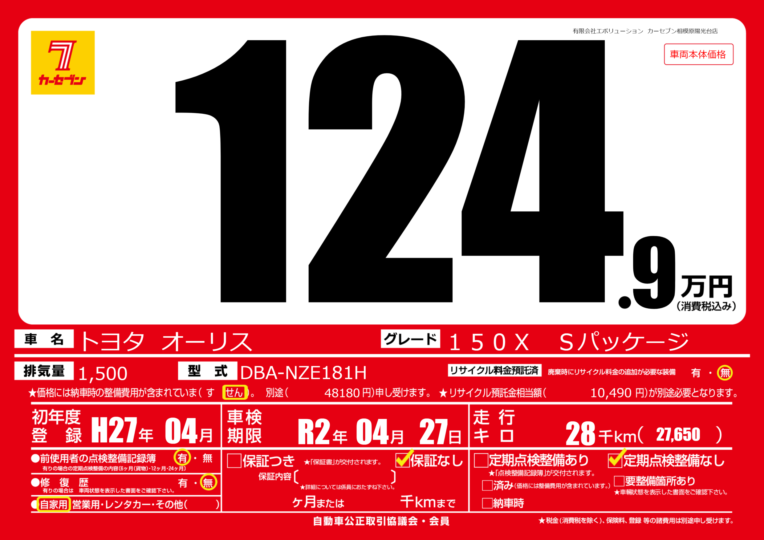 | 車名 | トヨタ オーリス | グレード ミッション 排気量 |