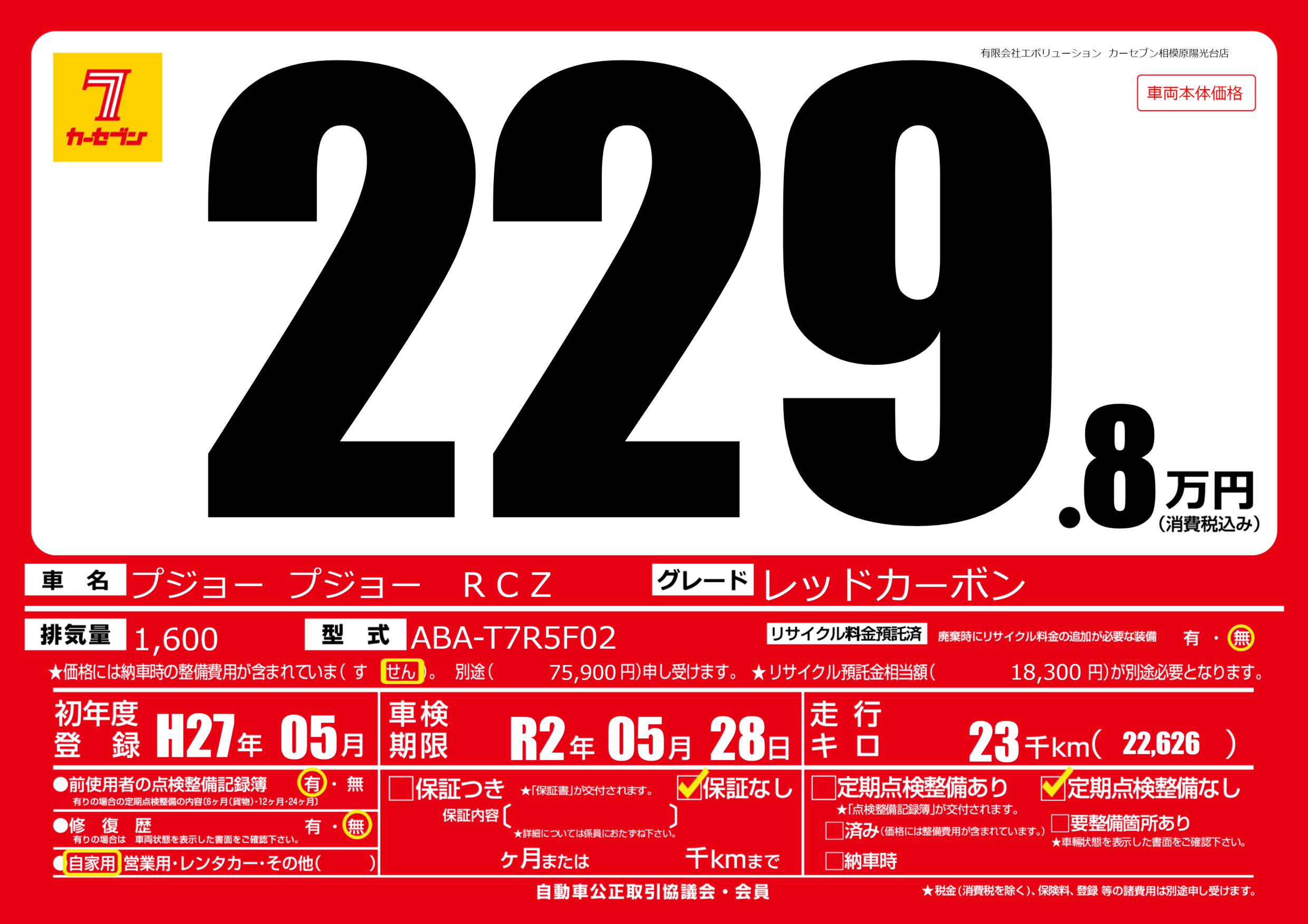 | 走行キロ | 2.3万km | 初年度登録 | H27年05月 |