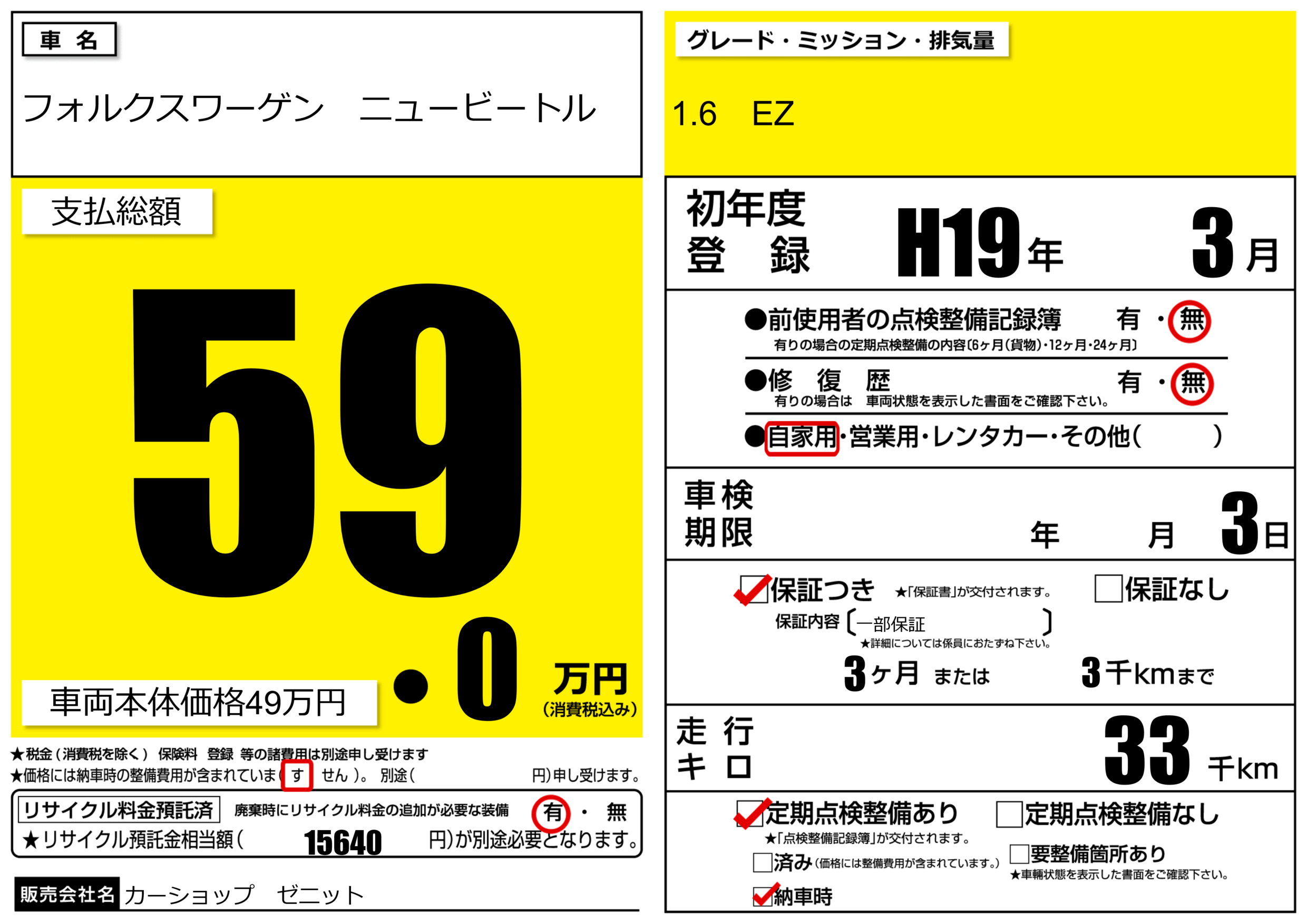 | 車名 | フォルクスワーゲン ニュービートル | グレード ミッション 排気量 |