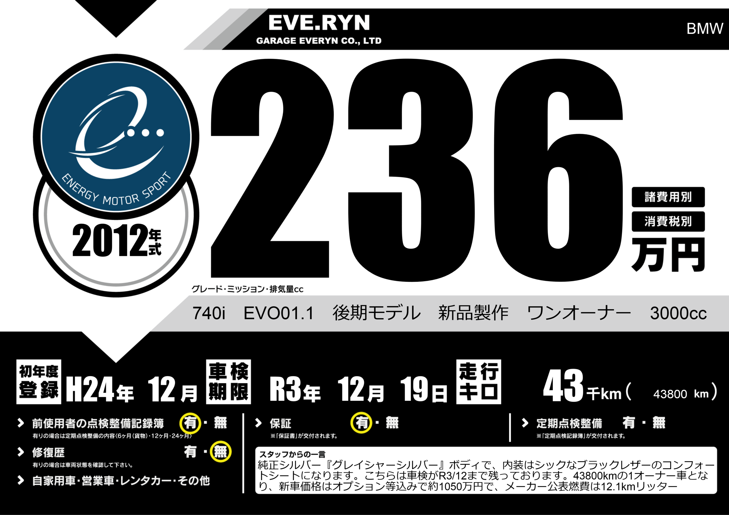 740i EVO01.1 後期モデル 新品製作 ワンオーナー 3000cc |