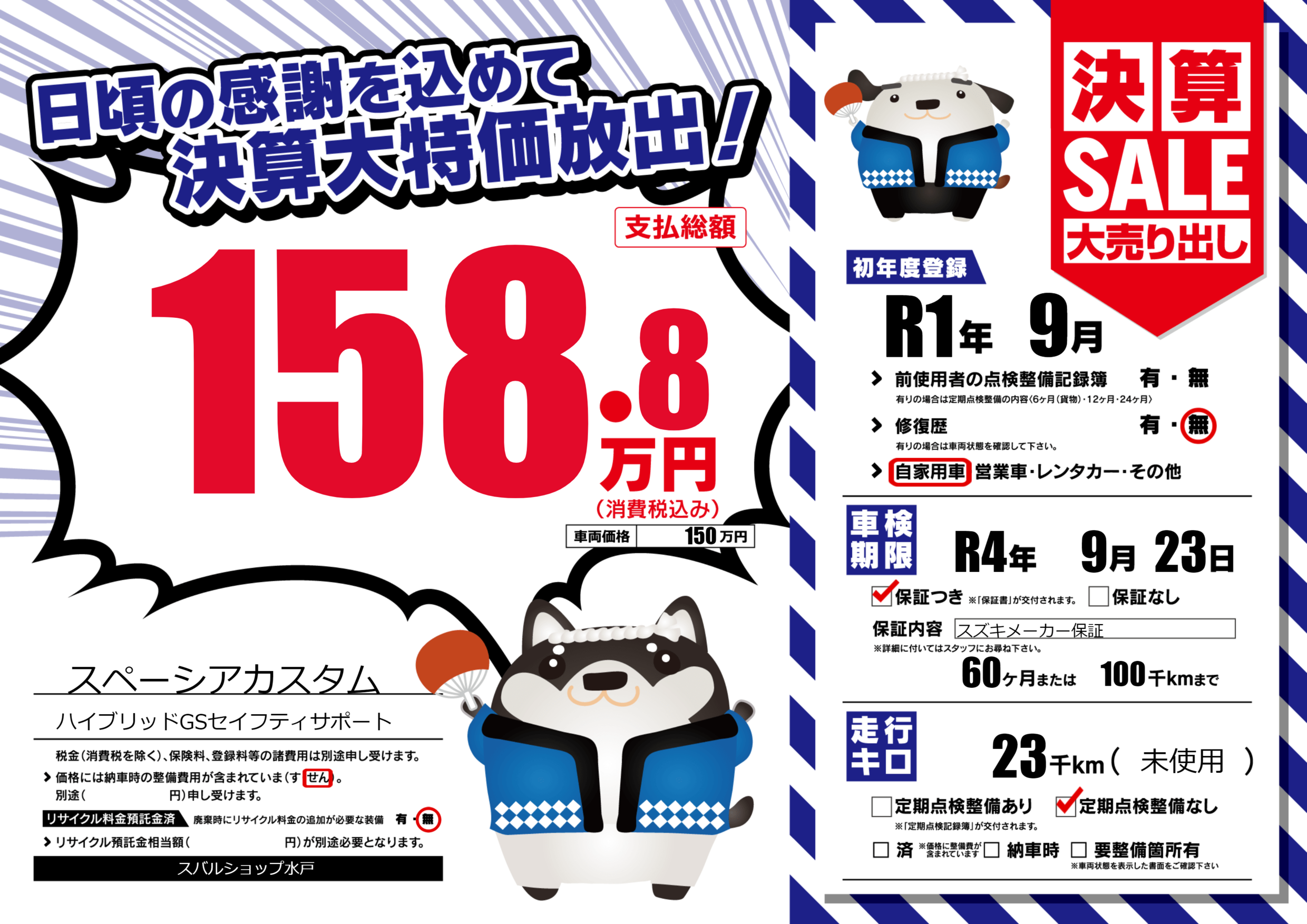 | 走行キロ | 2.3万km | 初年度登録 | R1年9月 |