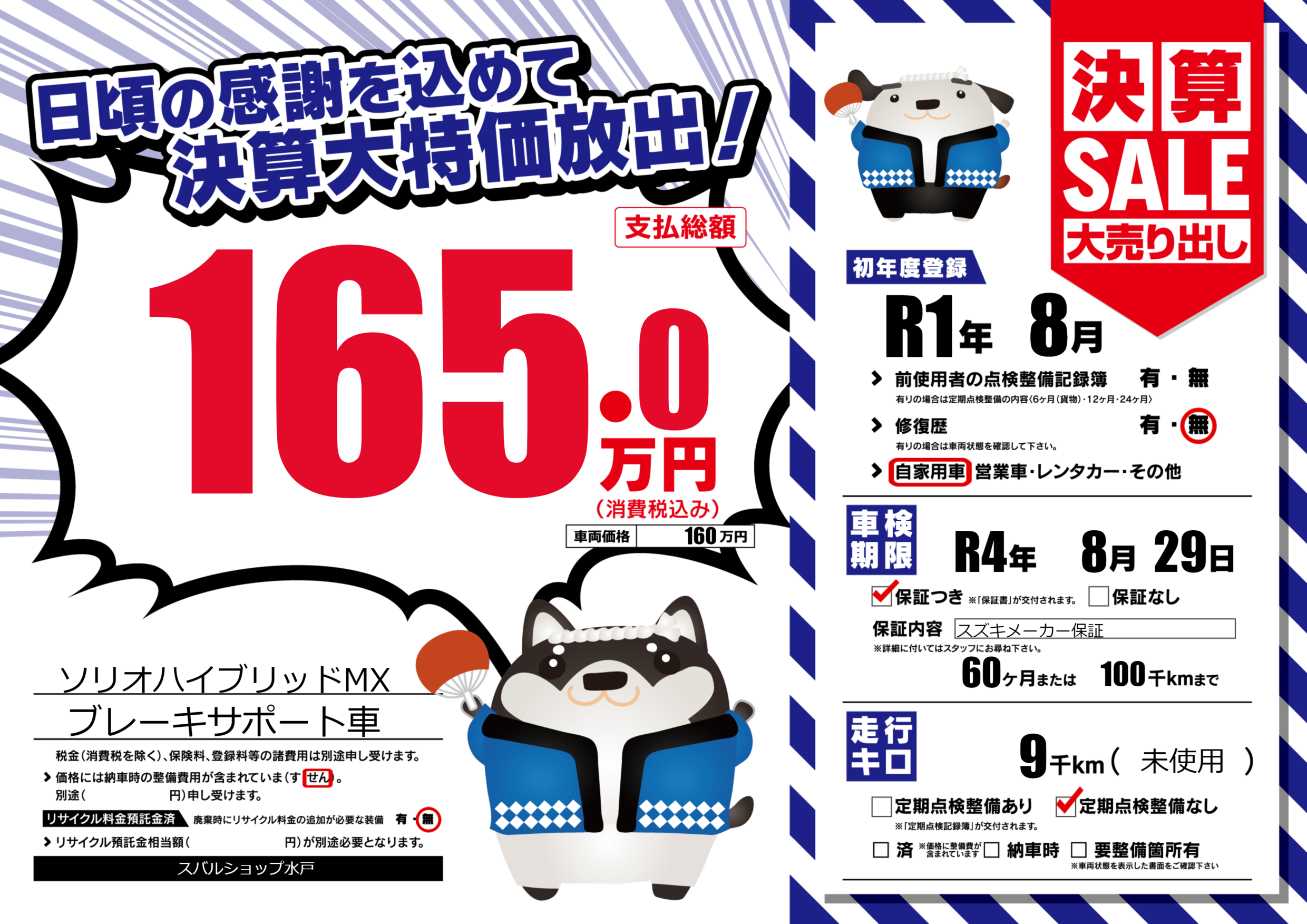 | 車名 | ソリオハイブリッドMX | グレード ミッション 排気量 |