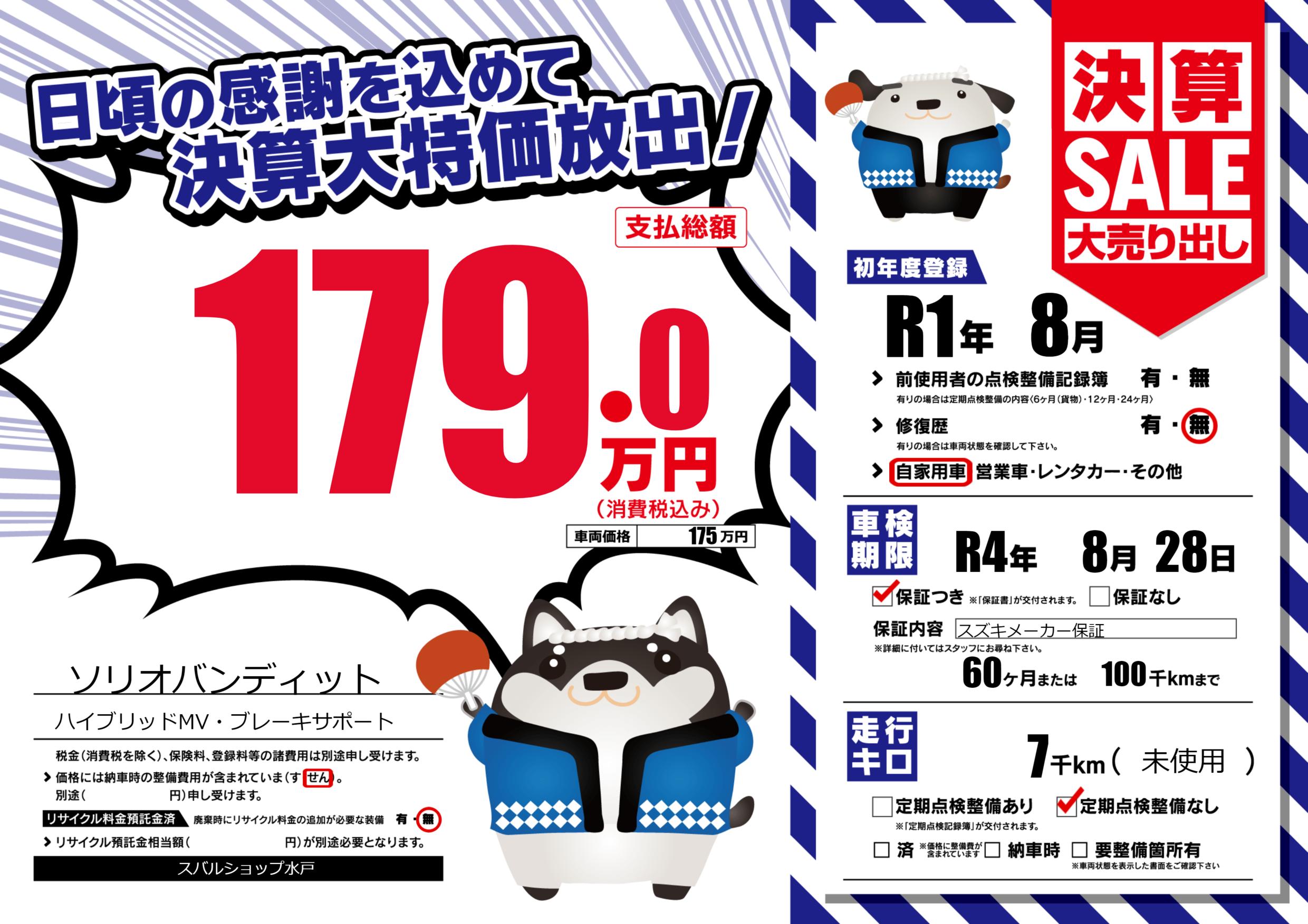| 走行キロ | 0.7万km | 初年度登録 | R1年8月 |