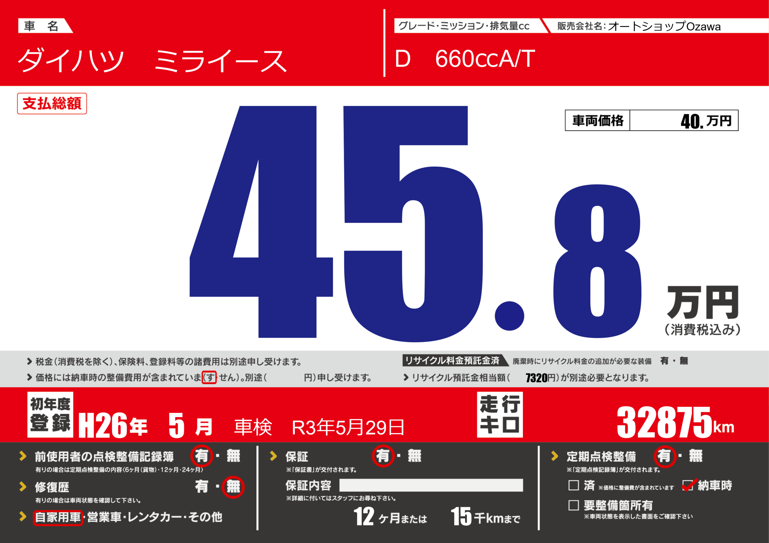 保証付き 保証内容(---) 12ヶ月または(15)千kmまで |