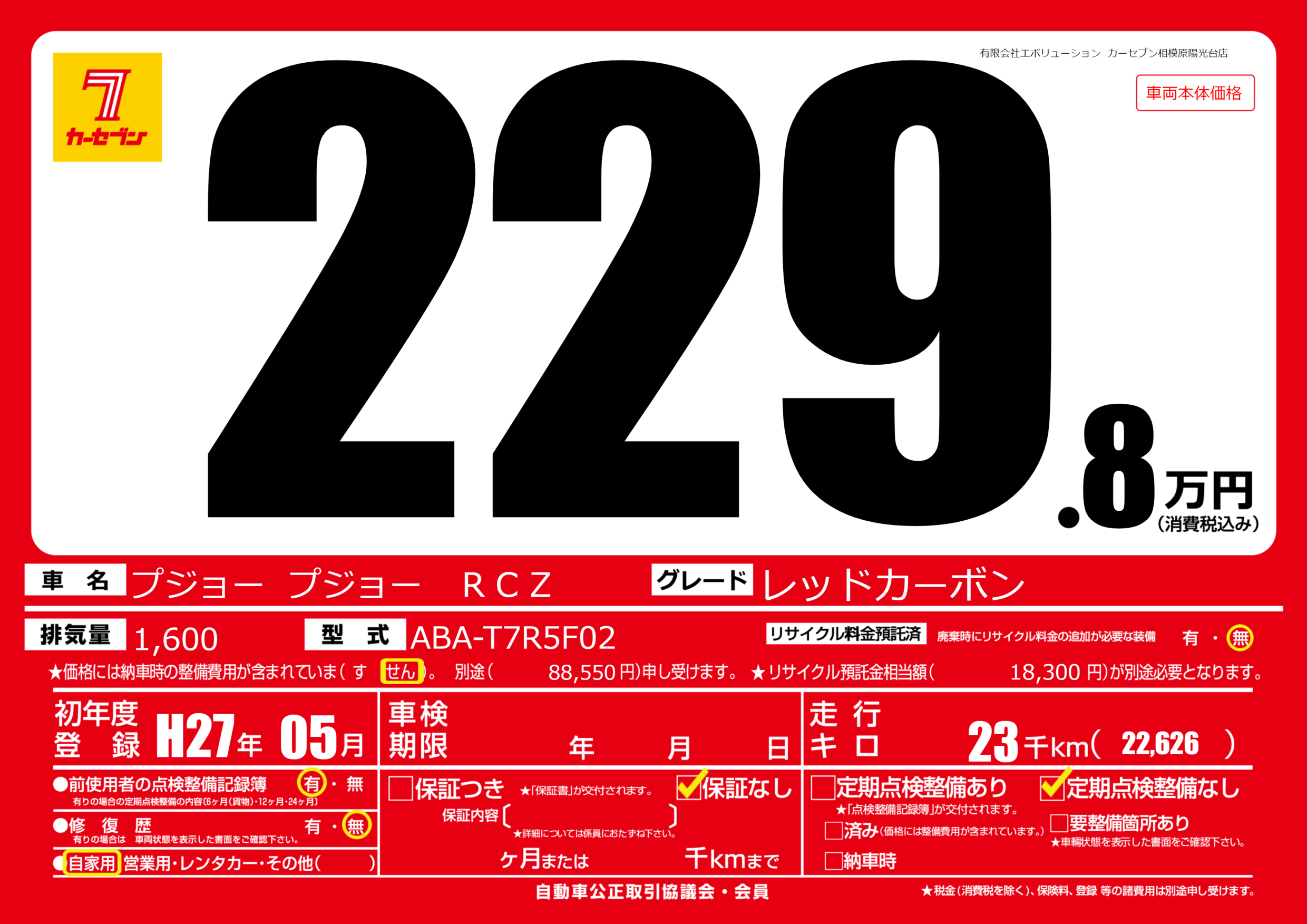 | 走行キロ | 2.3万km | 初年度登録 | H27年05月 |