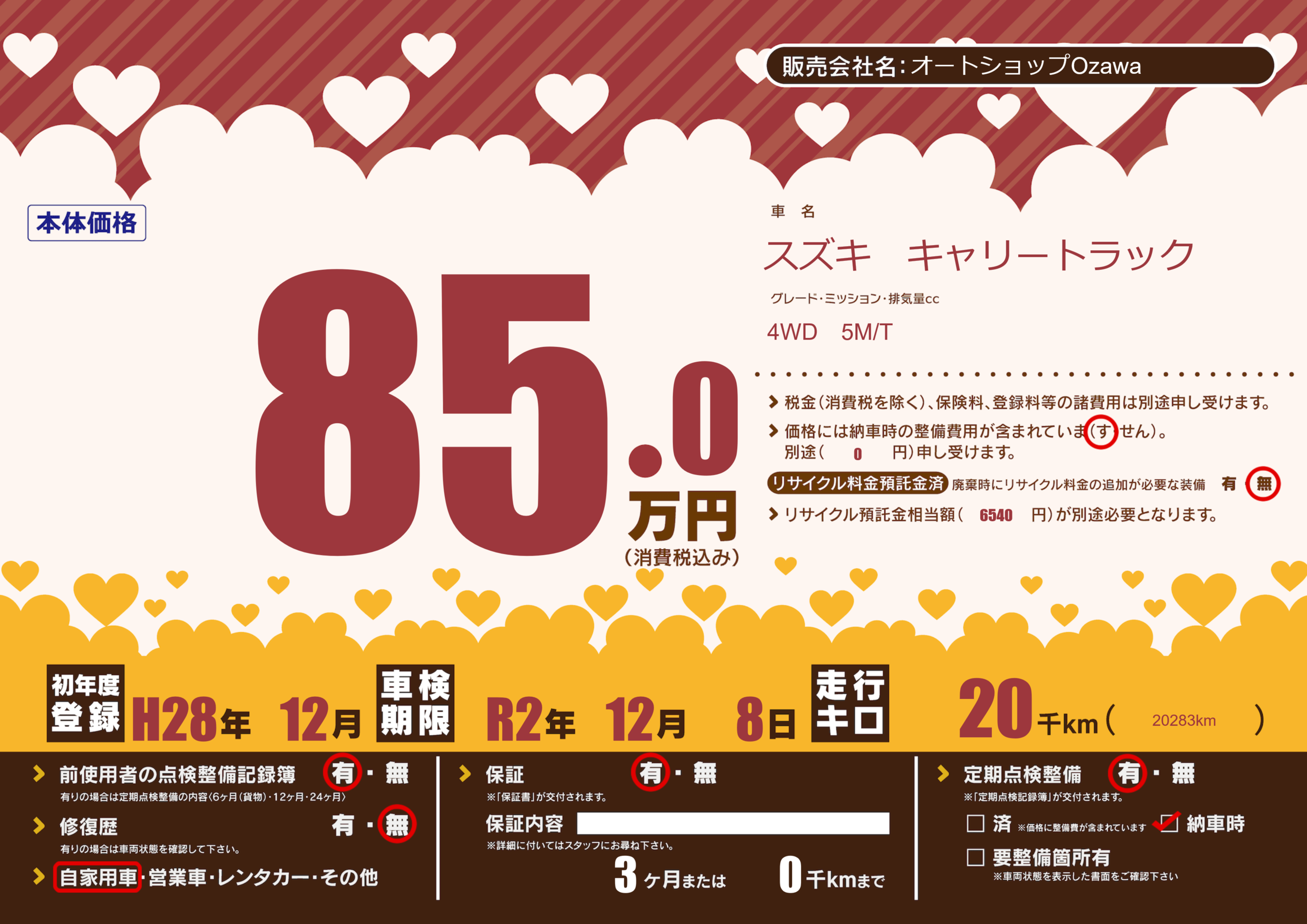 保証付き 保証内容(---) 3ヶ月または(0)千kmまで |