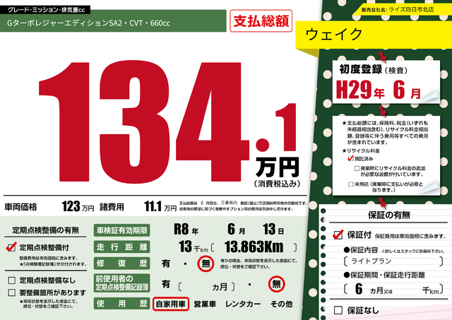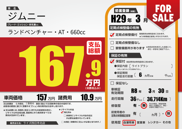 保証付き 保証内容(---) 1ヶ月または(1)千kmまで |