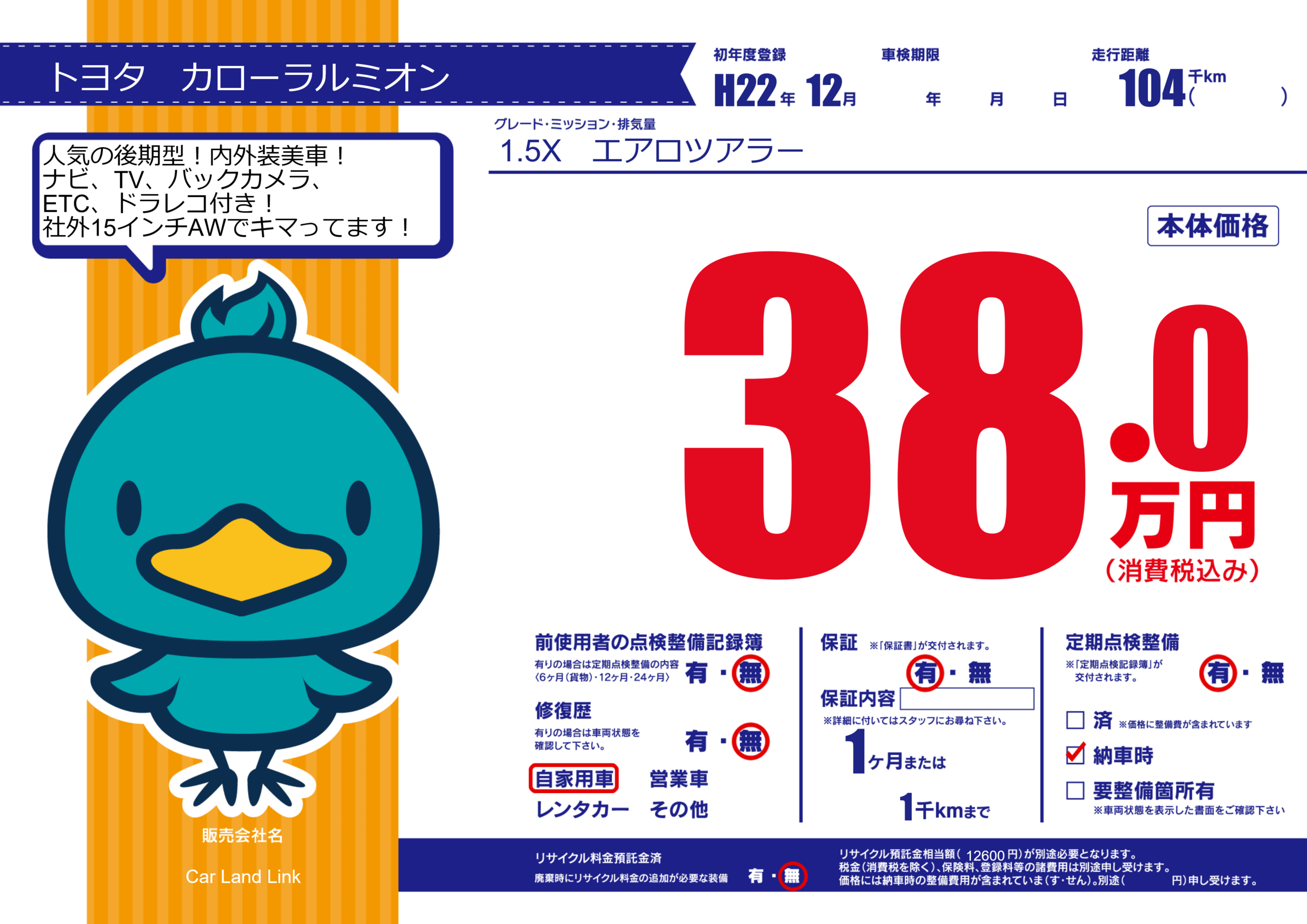 保証付き 保証内容(---) 1ヶ月または(1)千kmまで |