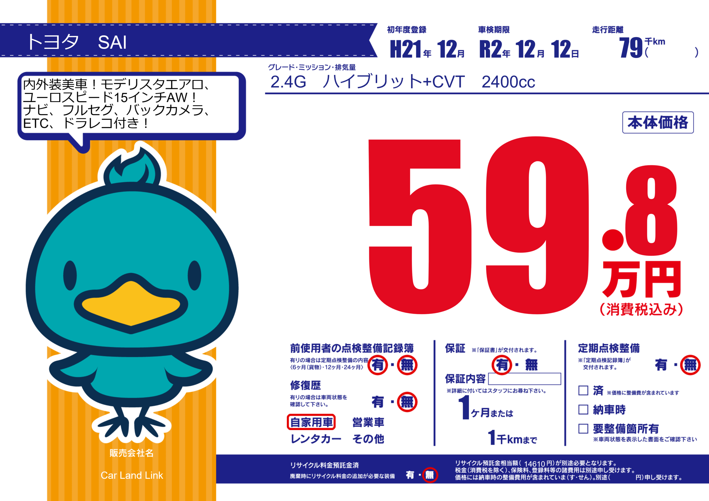 | 車名 | トヨタ SAI | グレード ミッション 排気量 |