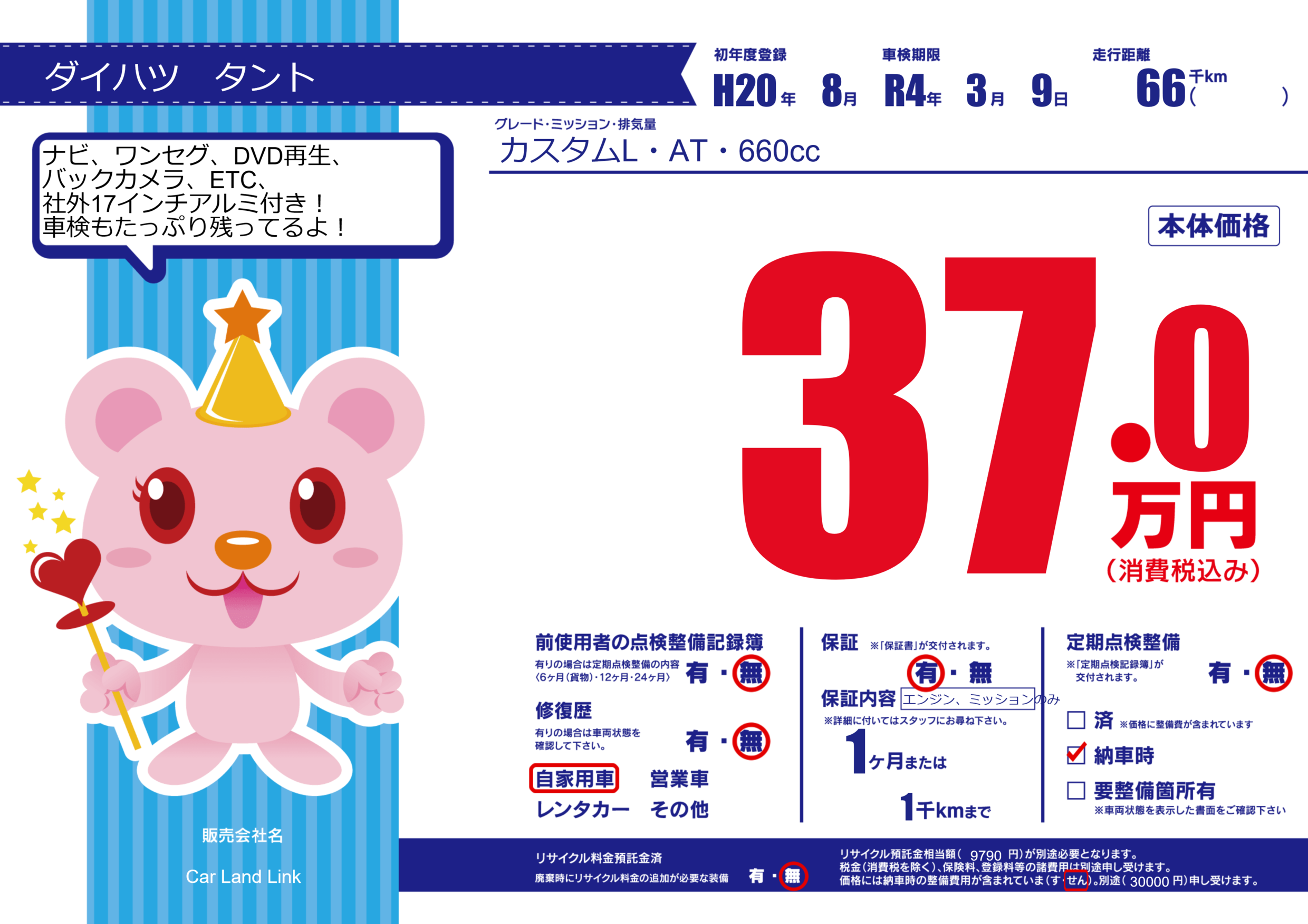 | 車名 | ダイハツ タント | グレード ミッション 排気量 |