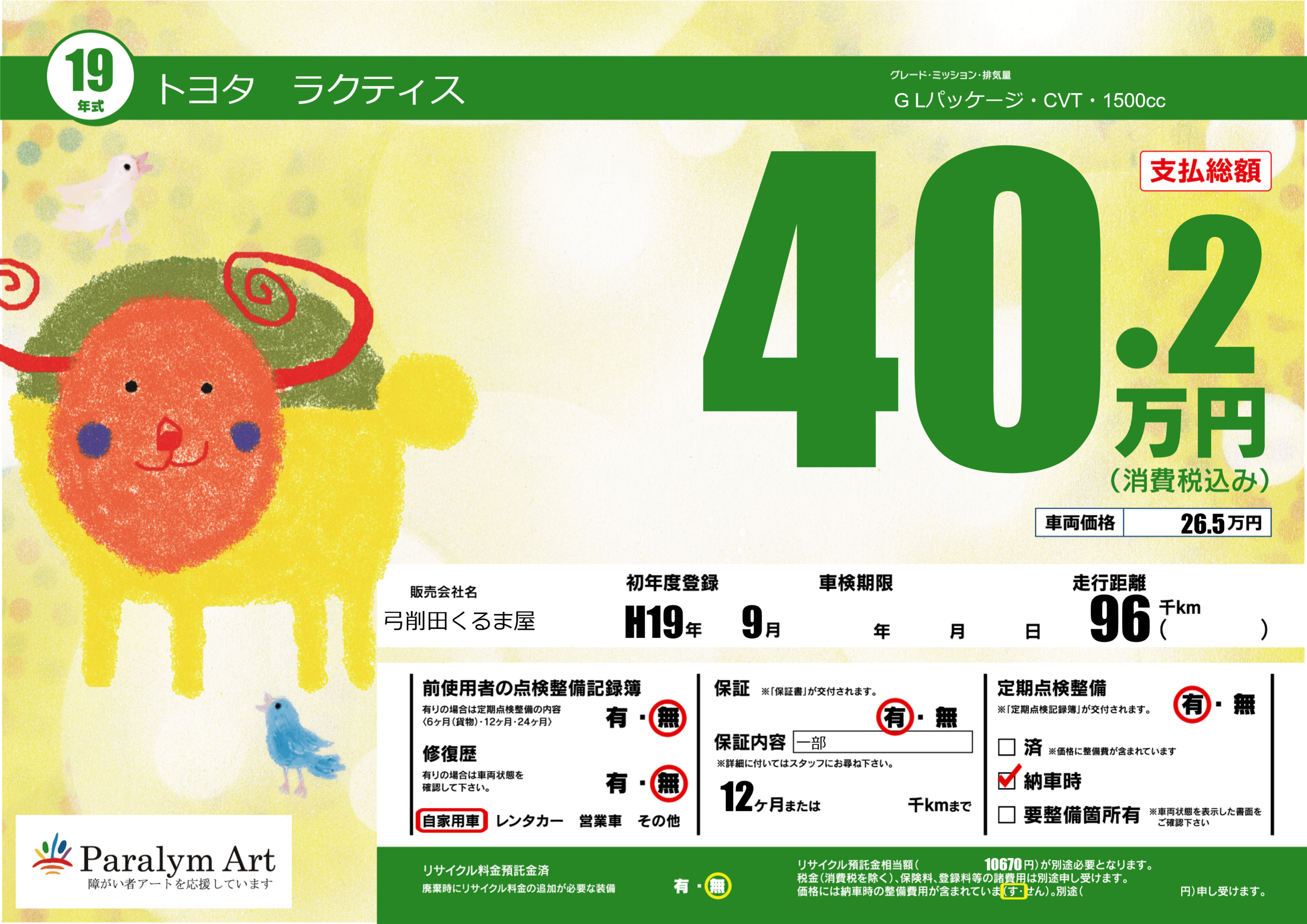 | 車名 | トヨタ ラクティス | グレード ミッション 排気量 |