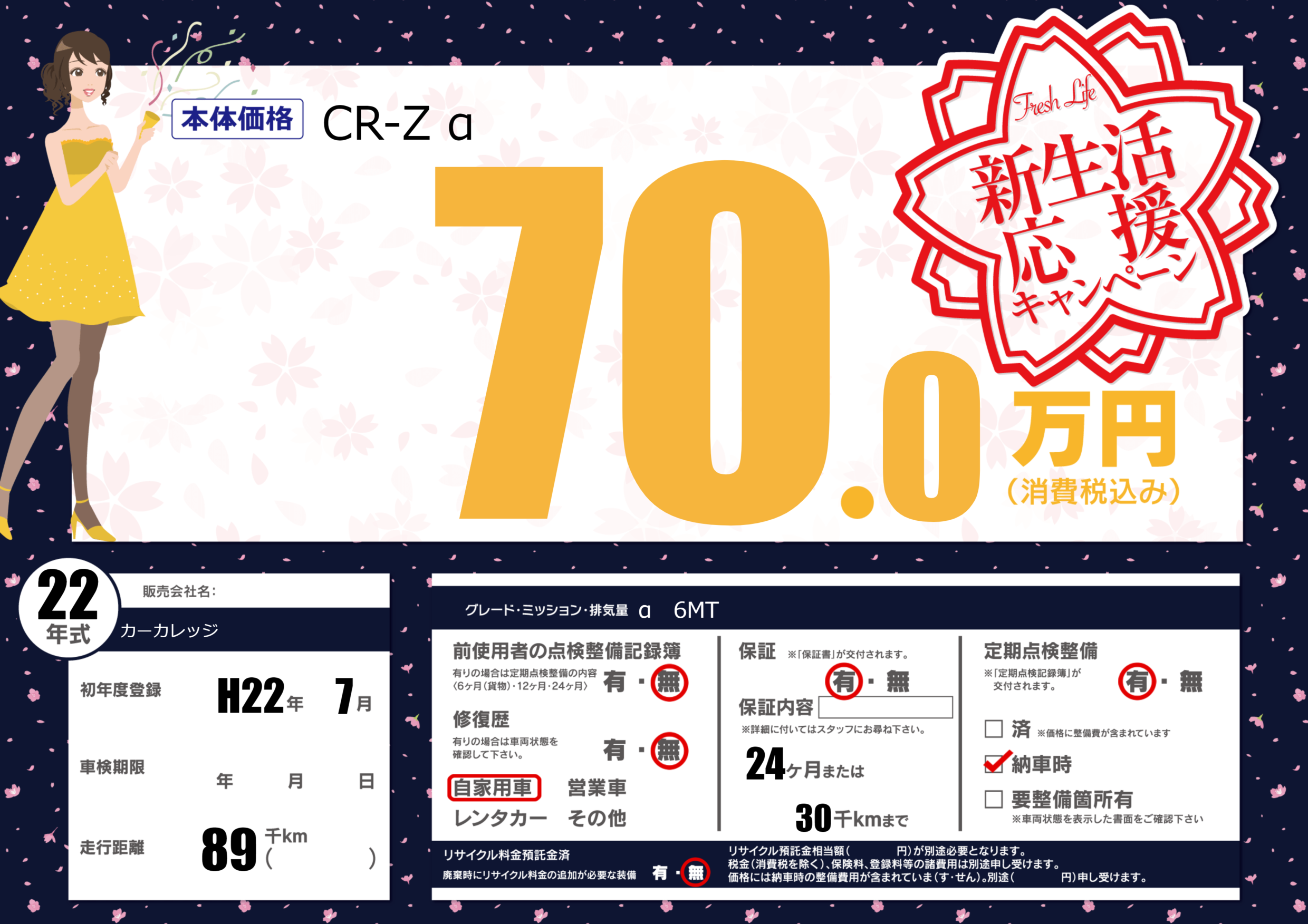 保証付き 保証内容(---) 24ヶ月または(30)千kmまで |