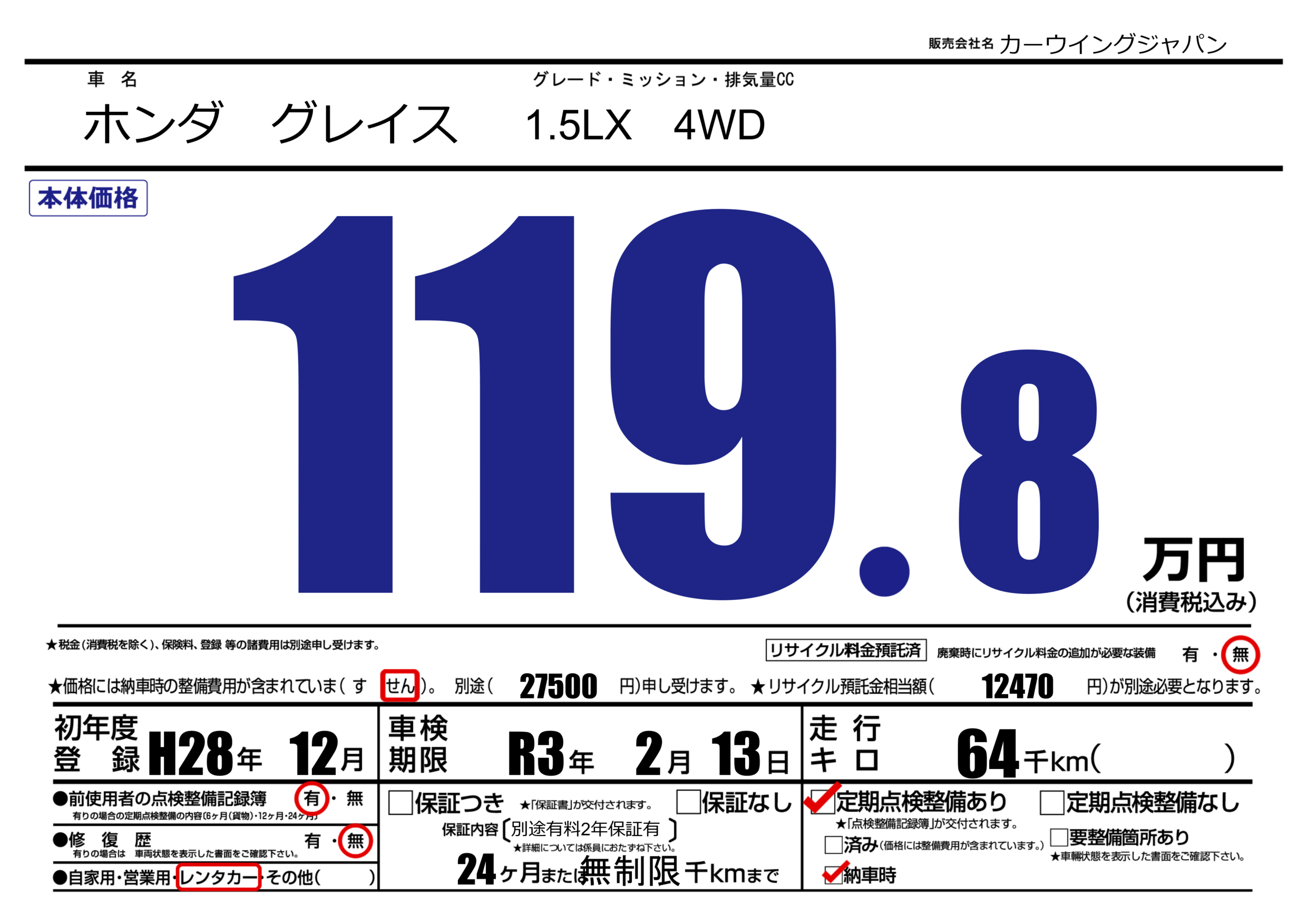 | 定期点検整備 | 定期点検整備あり 納車時あり | ||