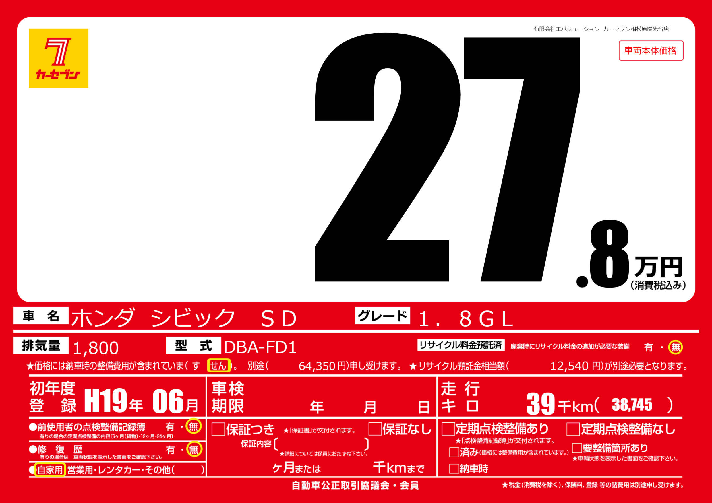 | 車名 | ホンダ シビック SD | グレード ミッション 排気量 |