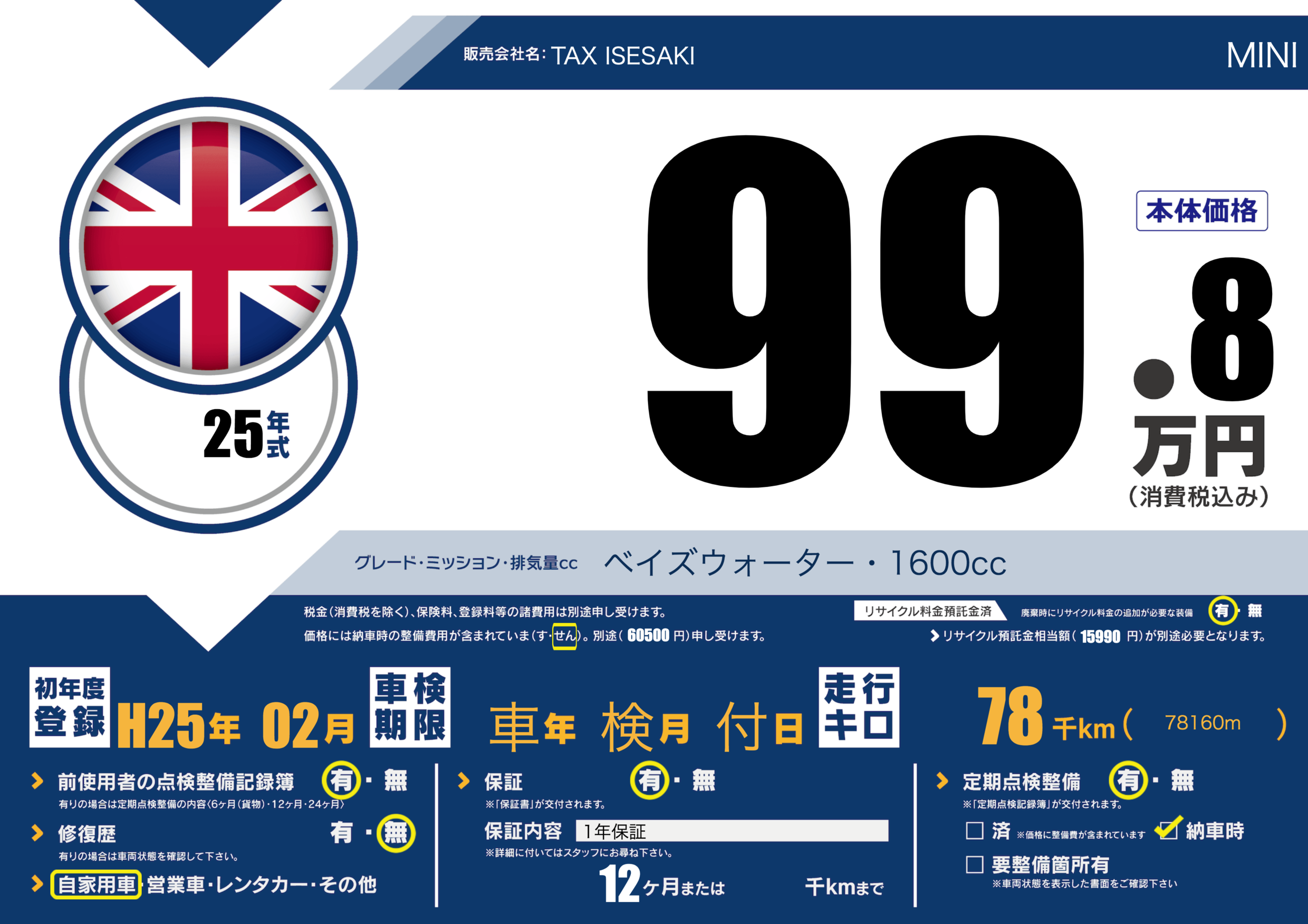 | 走行キロ | 7.8万km | 初年度登録 | H25年02月 |