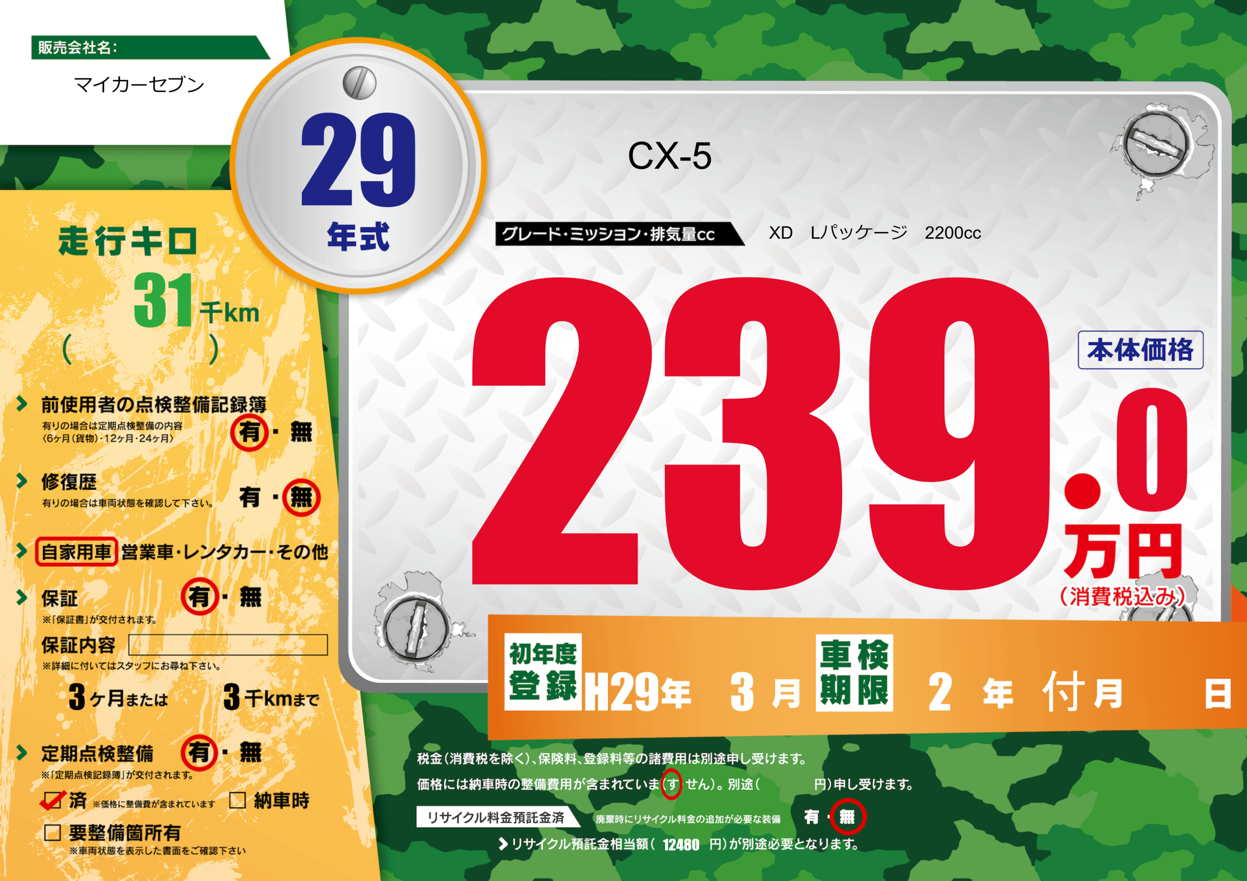 | 定期点検整備 | 定期点検整備あり 定期点検整備済み | ||