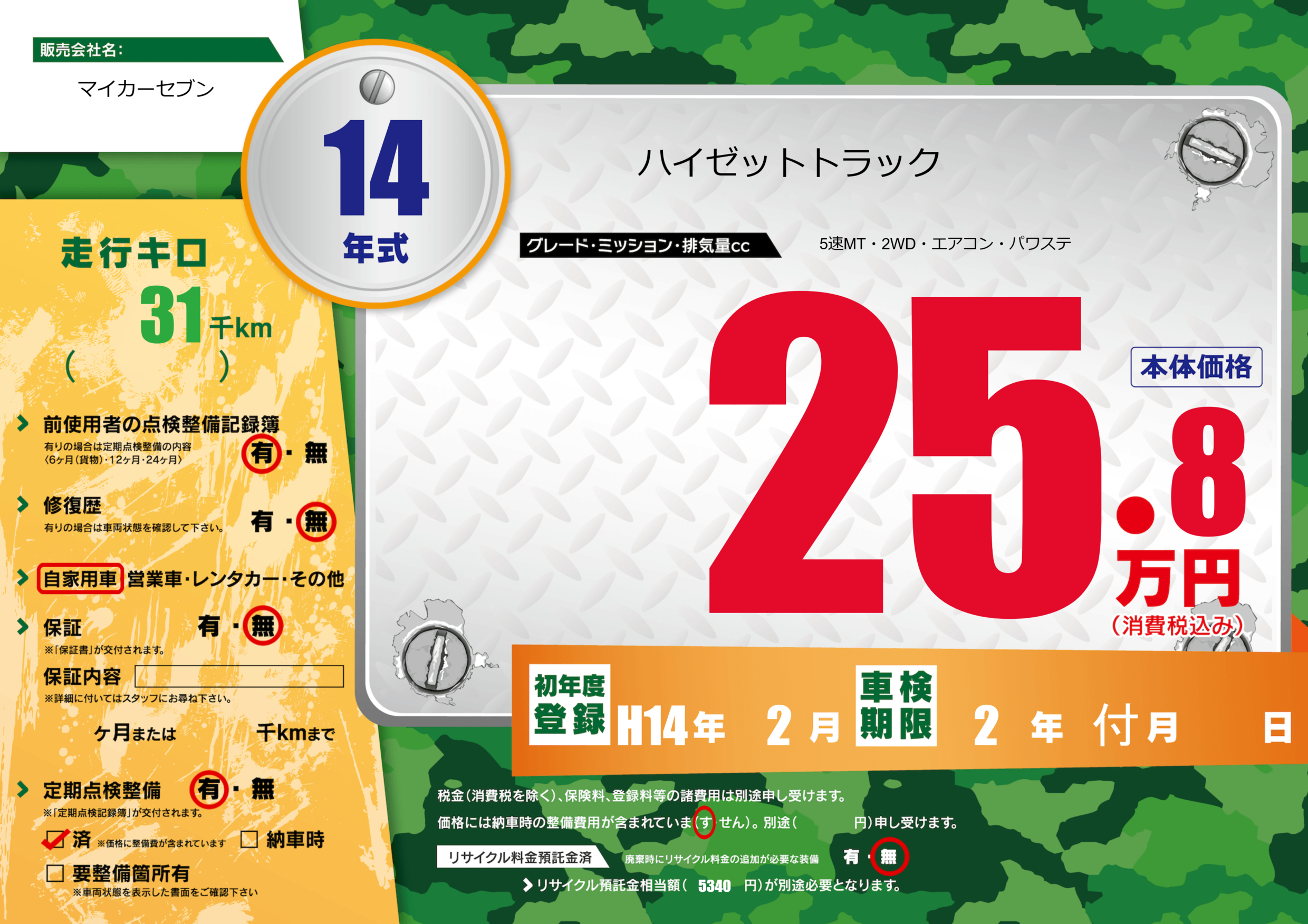 | 定期点検整備 | 定期点検整備あり 定期点検整備済み | ||