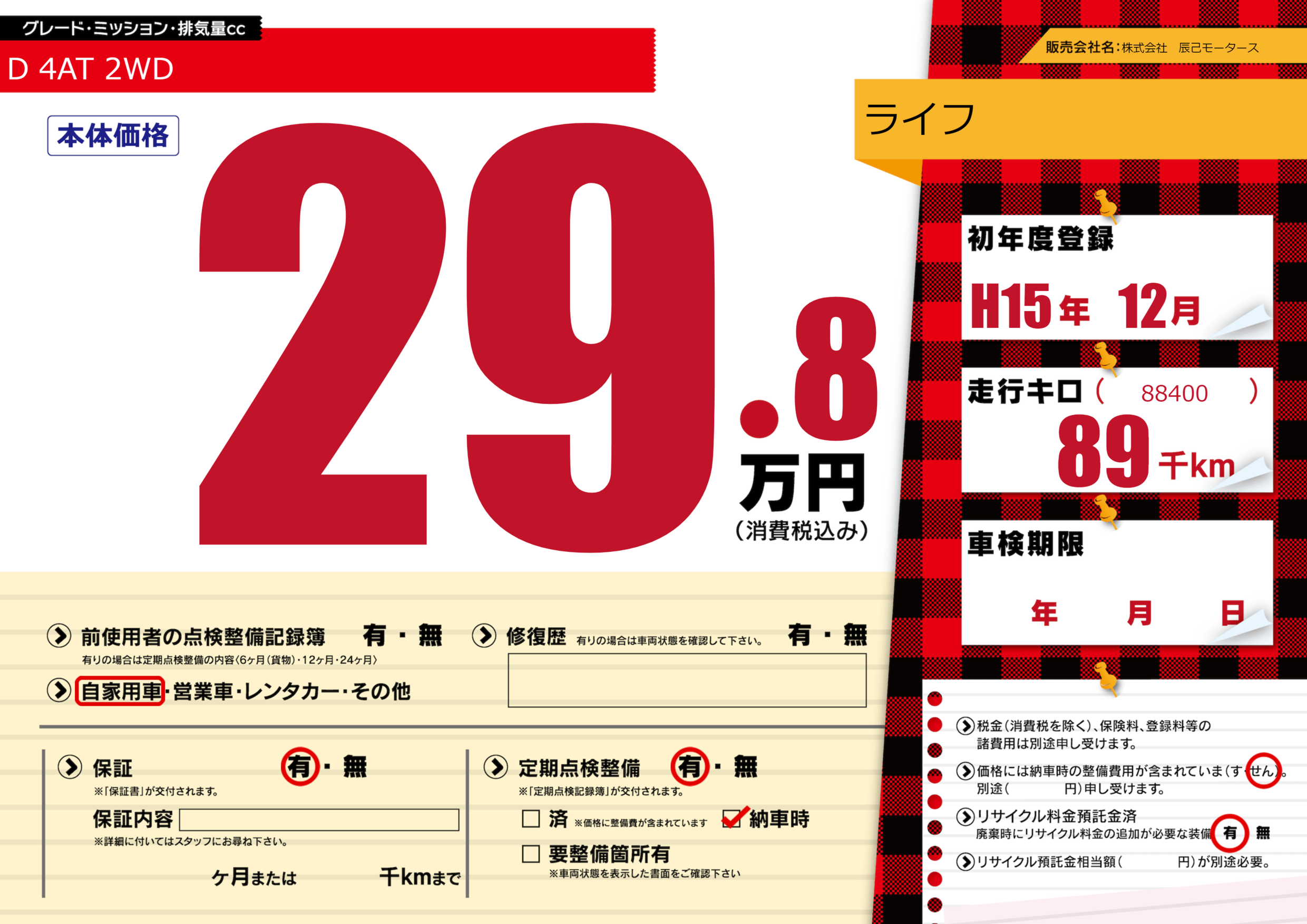 | 車名 | ライフ | グレード ミッション 排気量 |