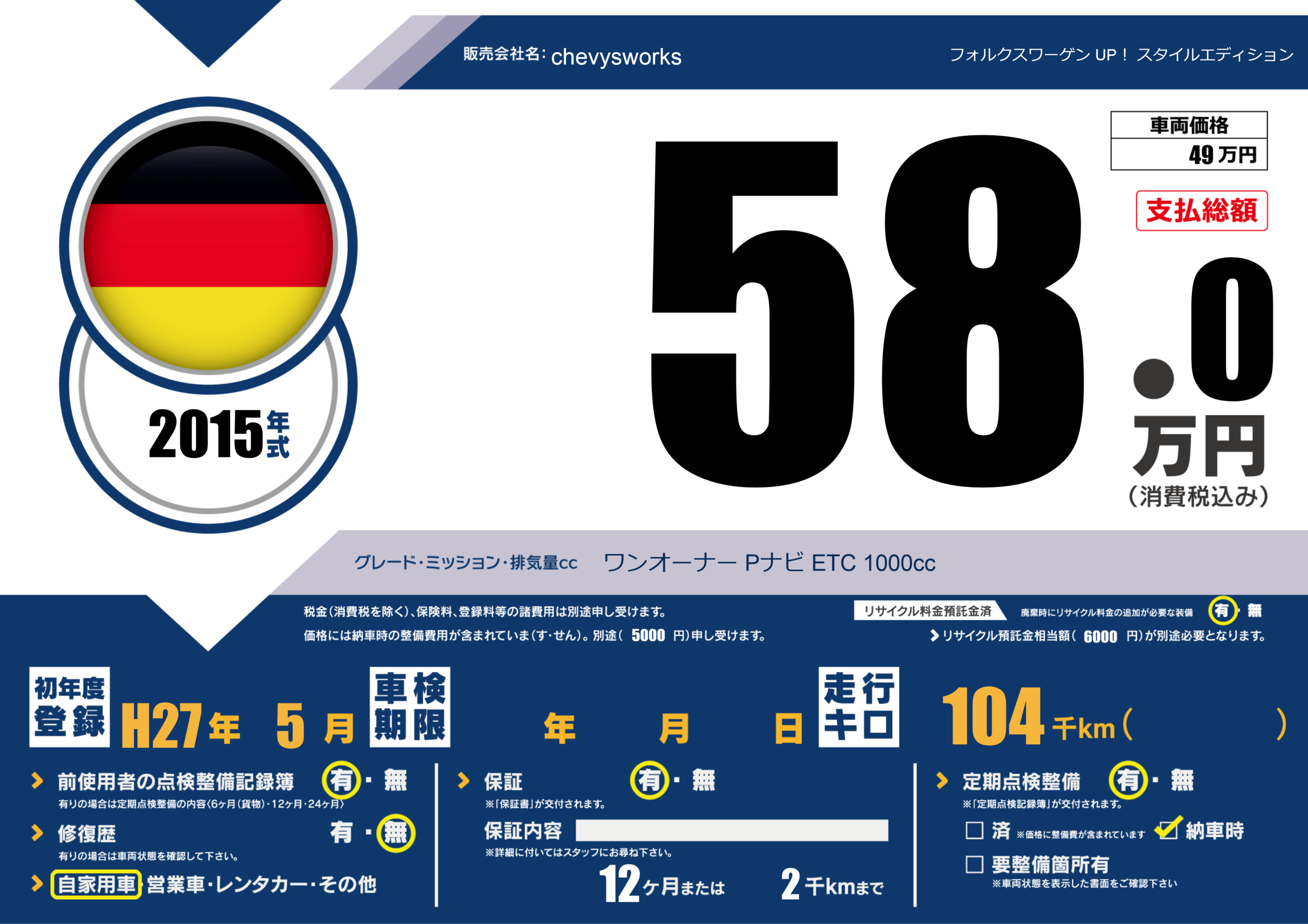| 車名 | フォルクスワーゲン UP! スタイルエディション | グレード ミッション 排気量 |
