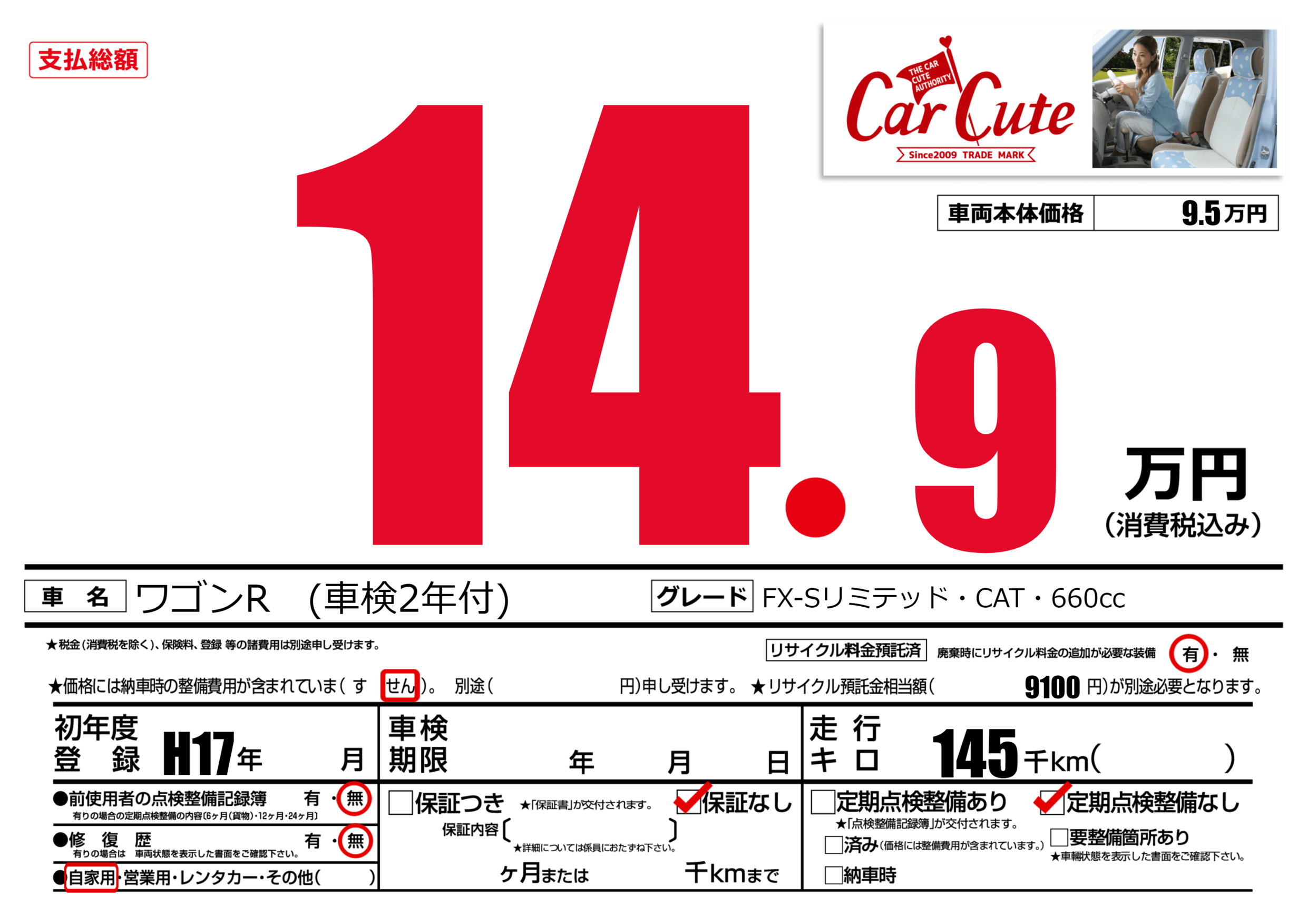 | 車名 | ワゴンR (車検2年付) | グレード ミッション 排気量 |