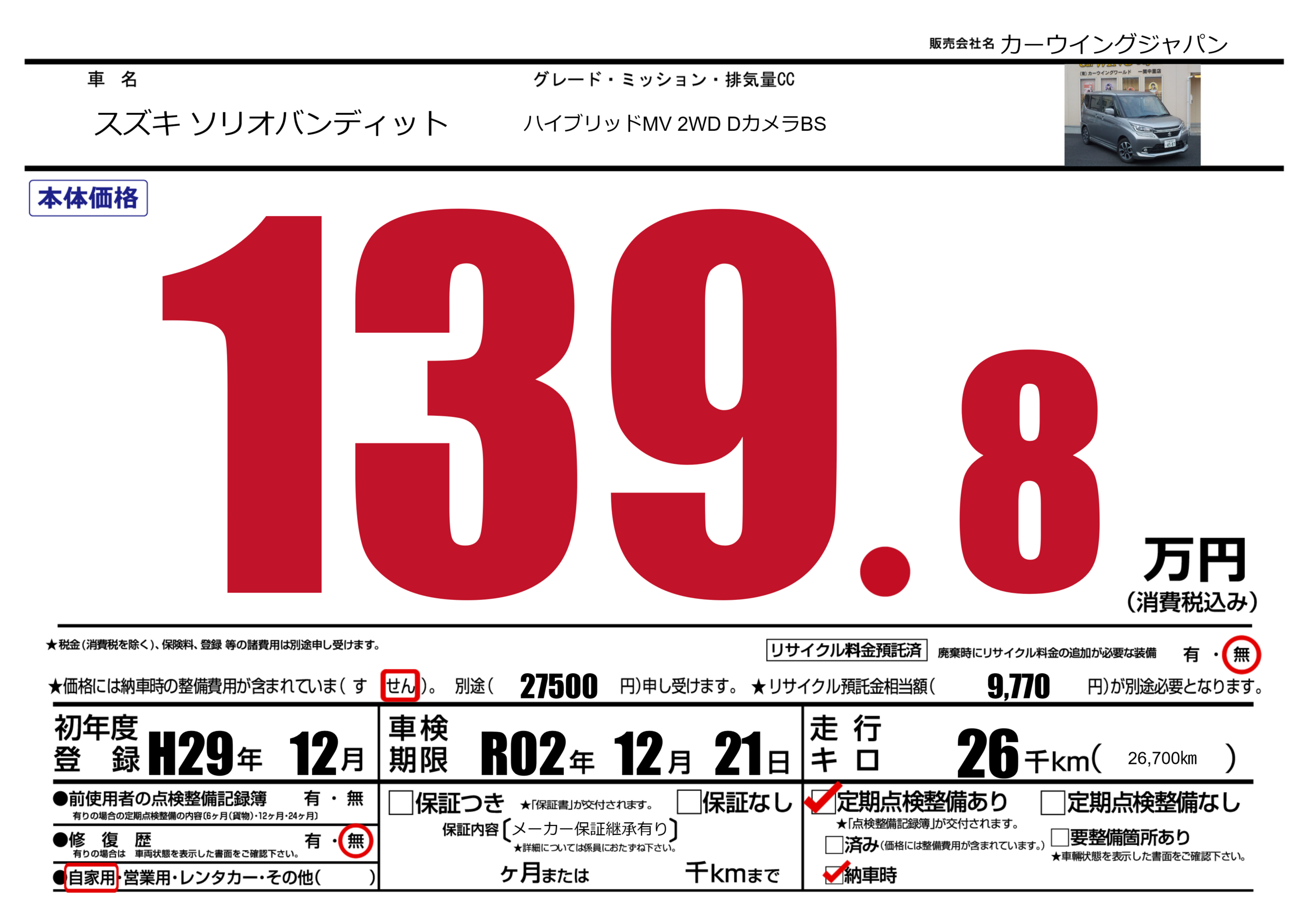 | 車検制限 | R02年 12月 21日 | ||