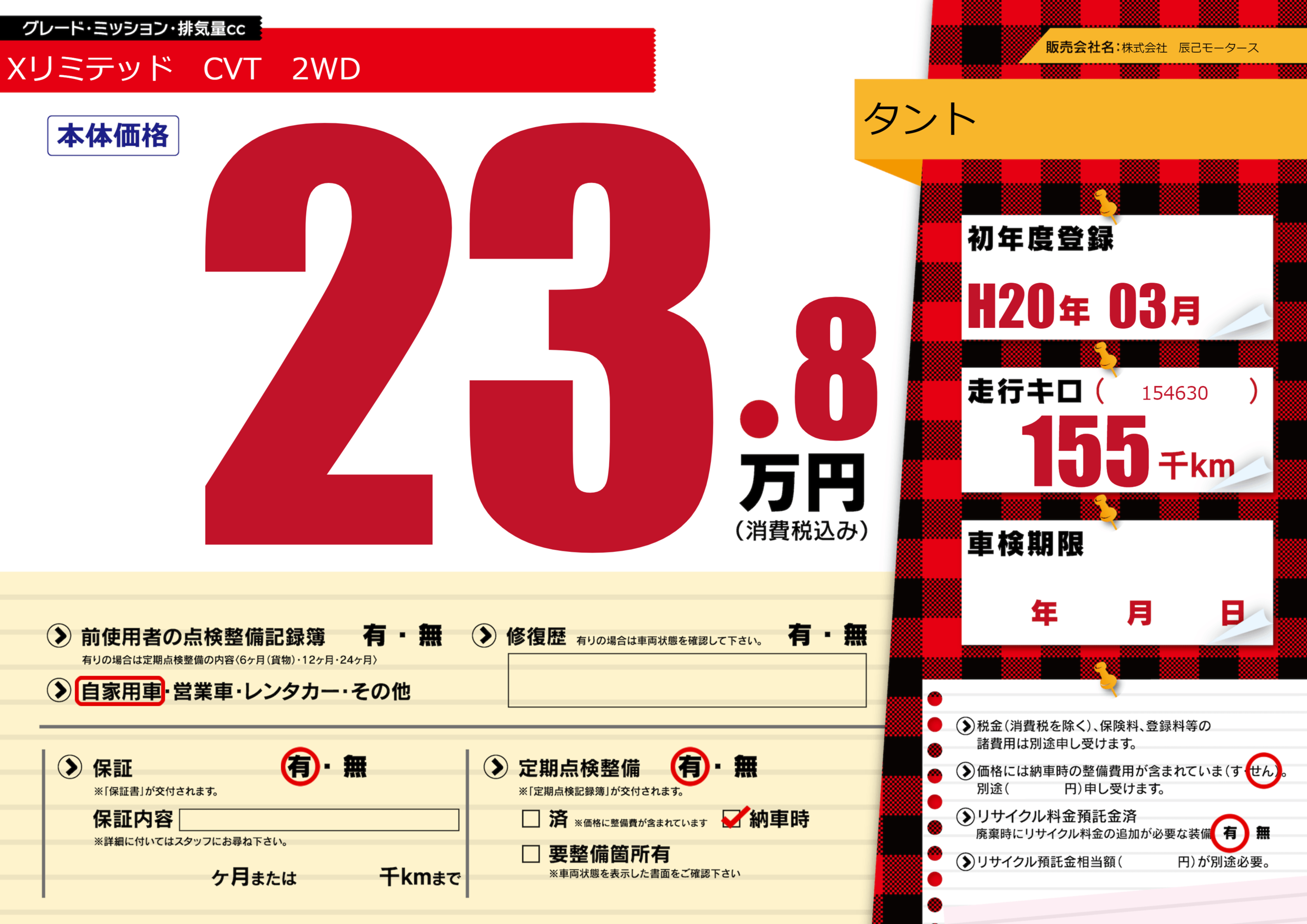 | 車名 | タント | グレード ミッション 排気量 |