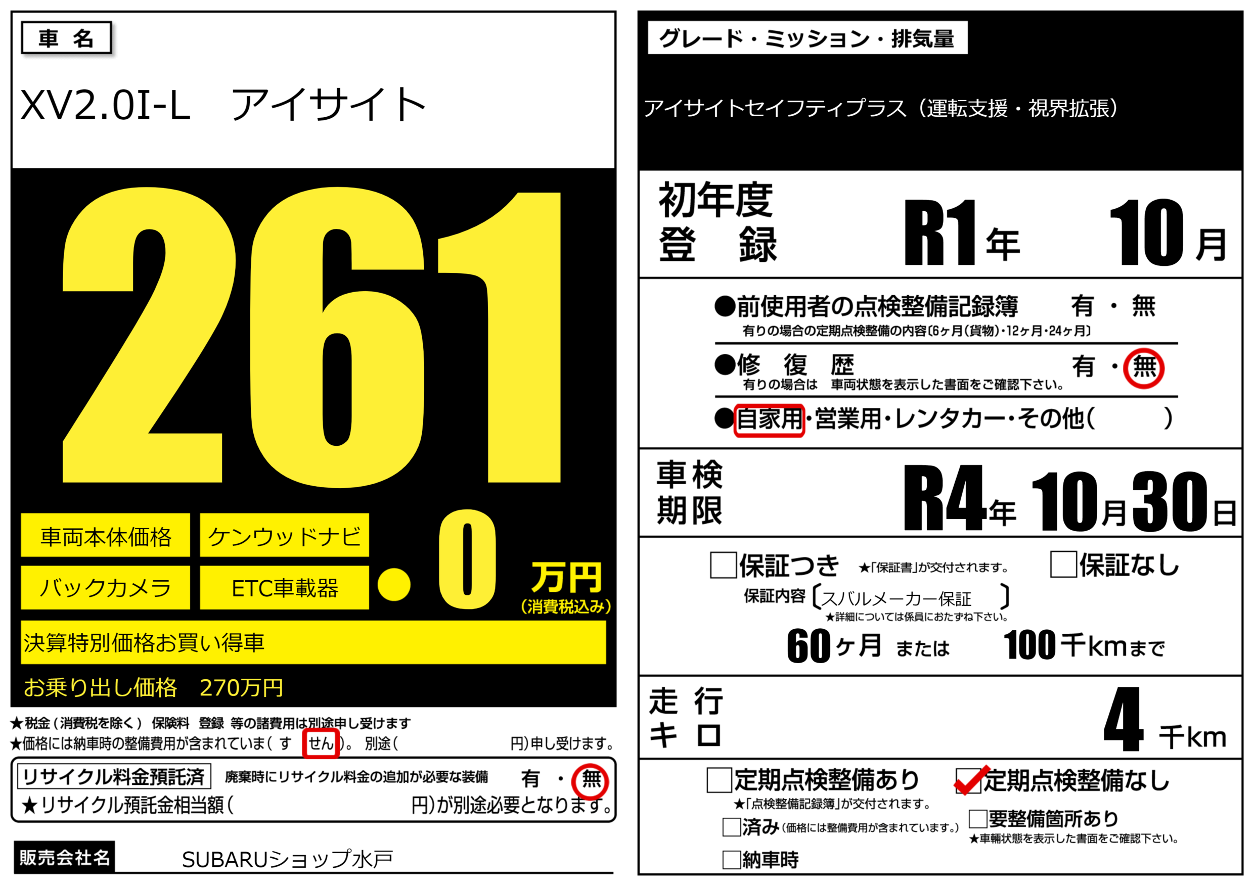 保証なし 保証内容(スバルメーカー保証) 60ヶ月または(100)千kmまで |