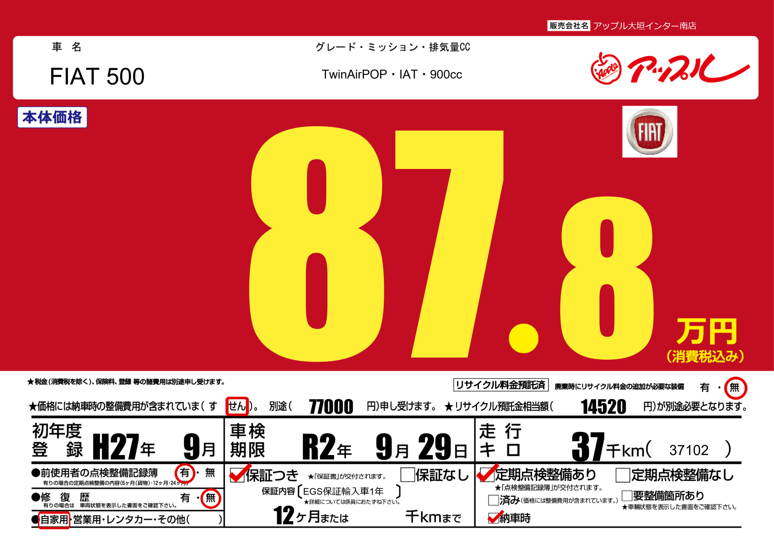 | 車名 | FIAT 500 | グレード ミッション 排気量 |