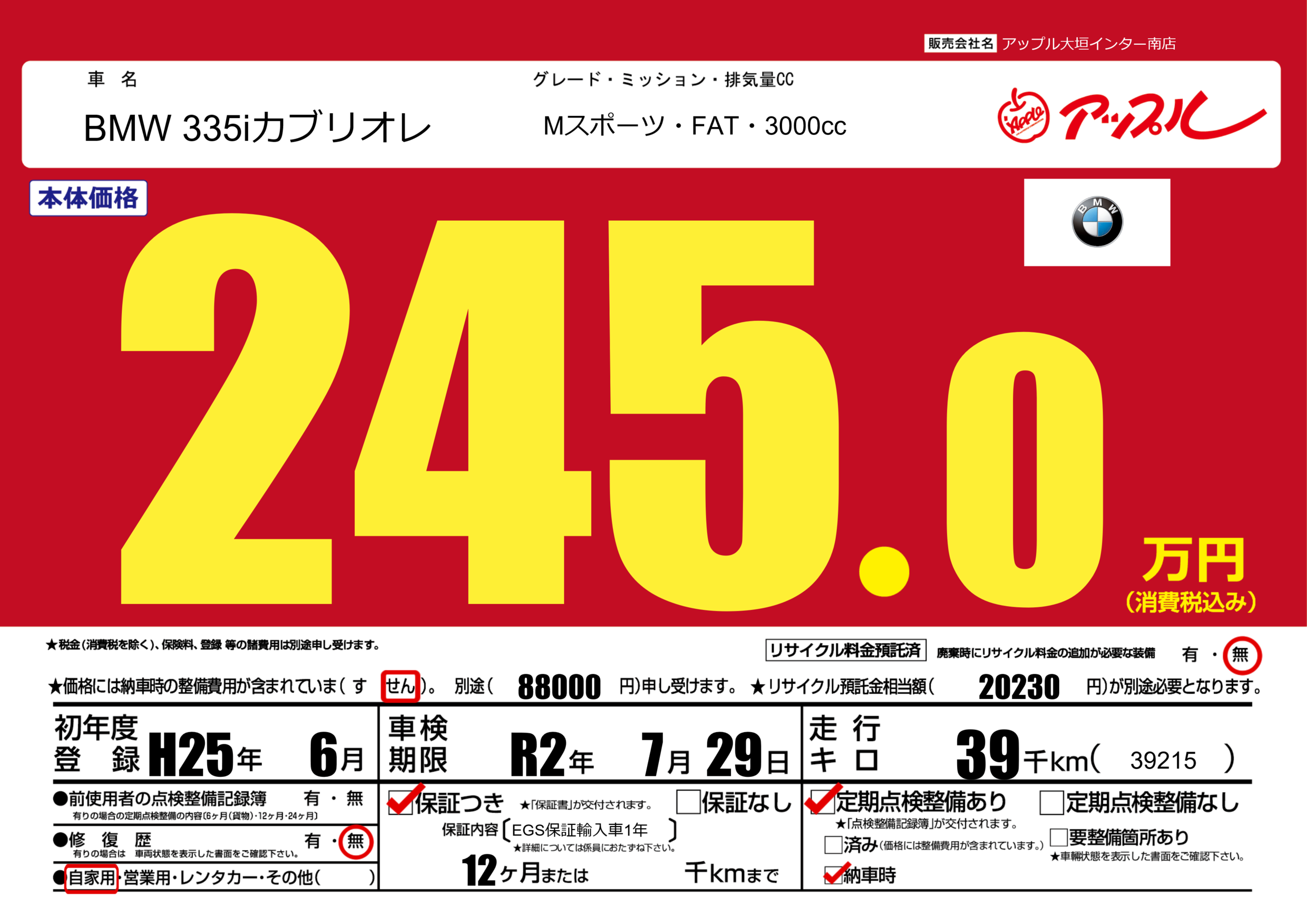 | 車名 | BMW 335iカブリオレ | グレード ミッション 排気量 |
