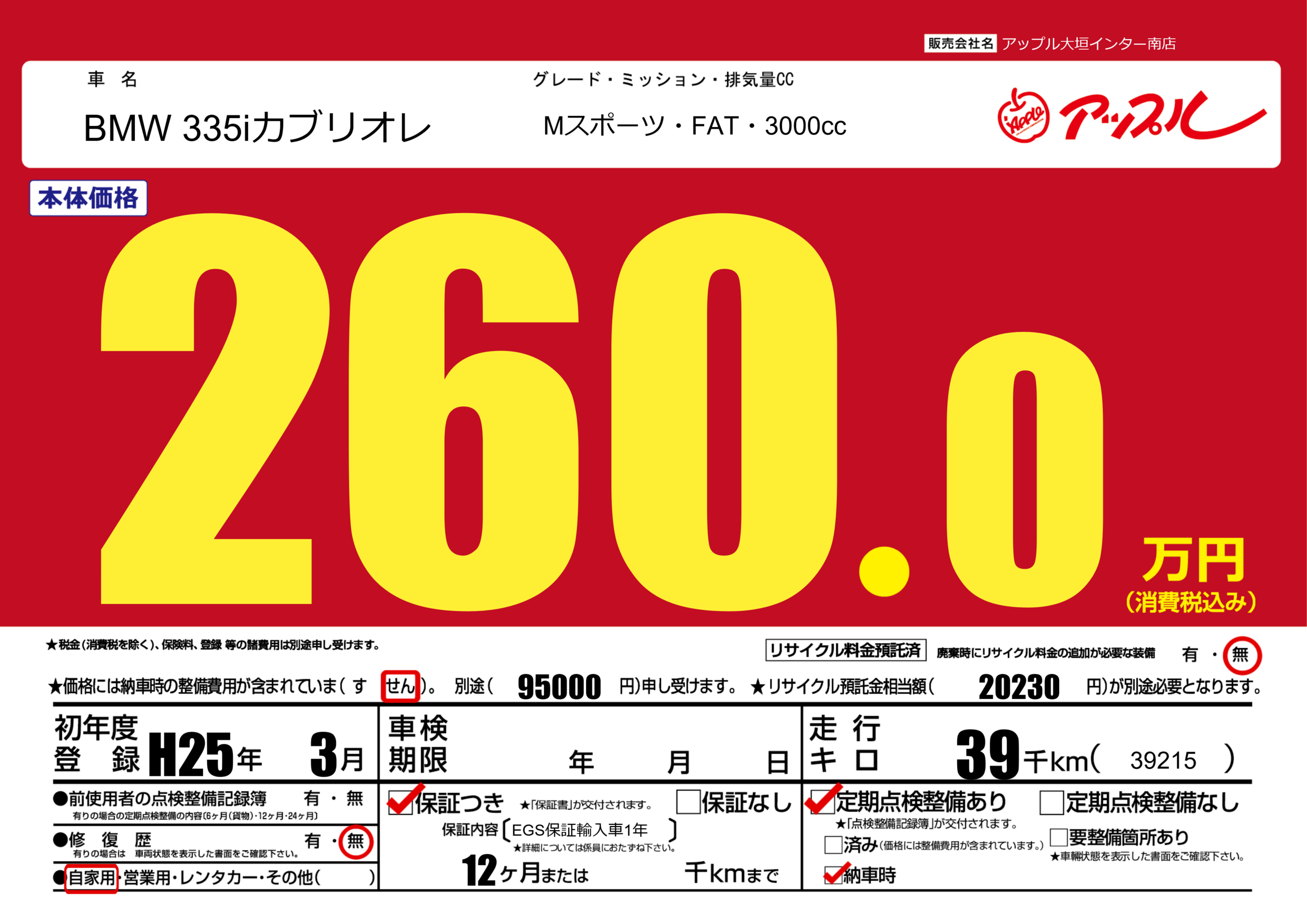 | 車名 | BMW 335iカブリオレ | グレード ミッション 排気量 |