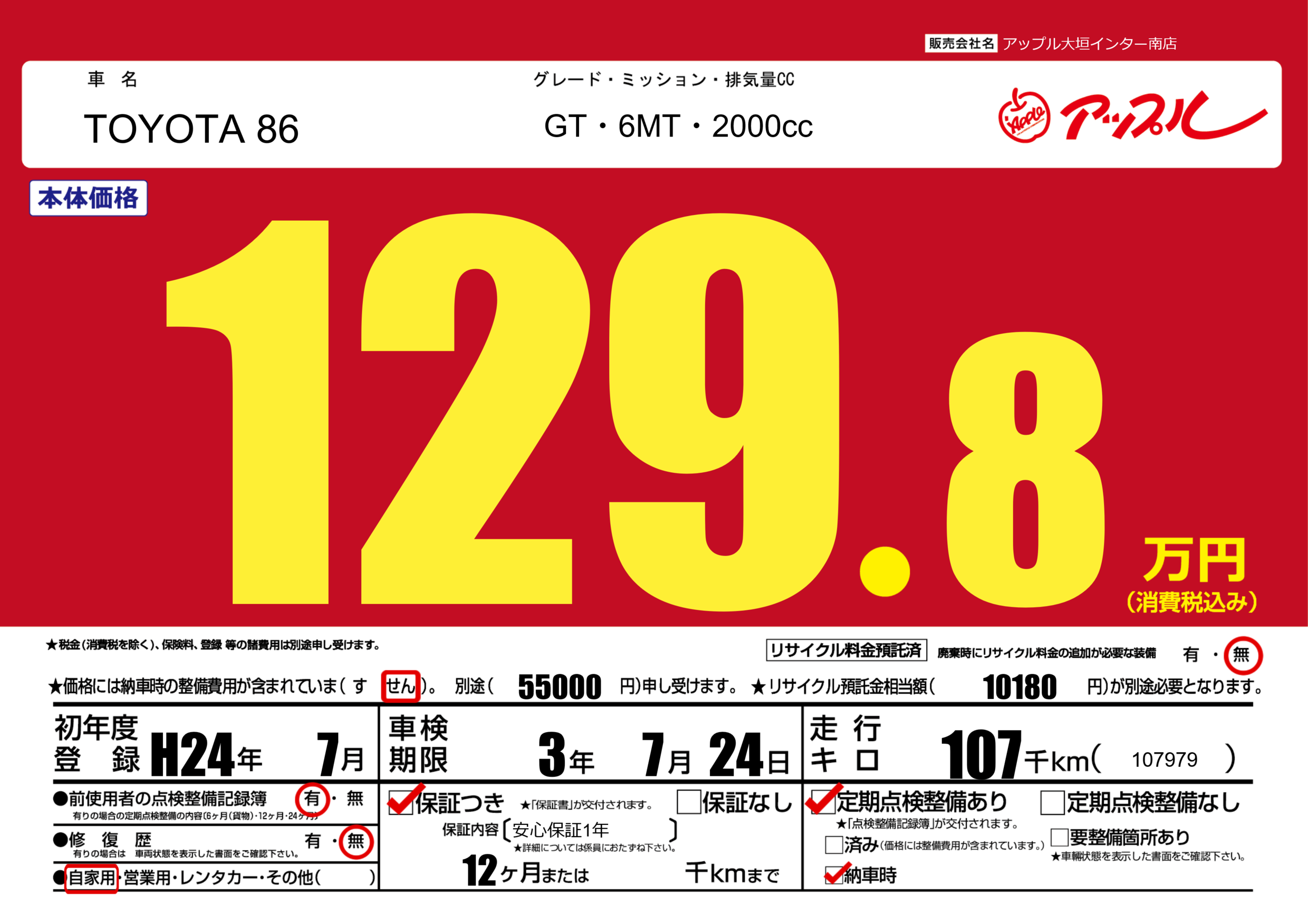 | 車名 | TOYOTA 86 | グレード ミッション 排気量 |