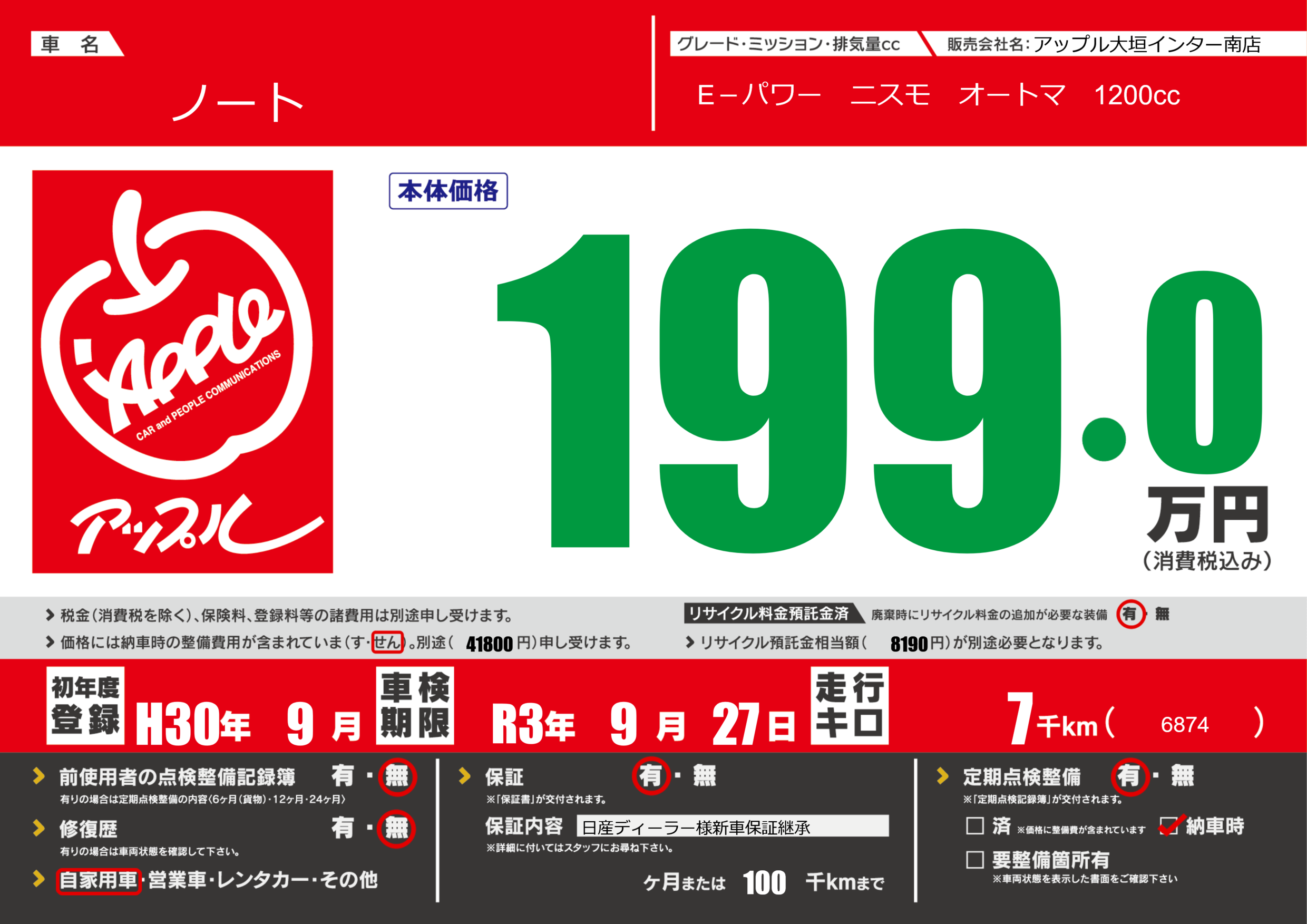 保証付き 保証内容(日産ディーラー様新車保証継承) ---ヶ月または(100)千kmまで |
