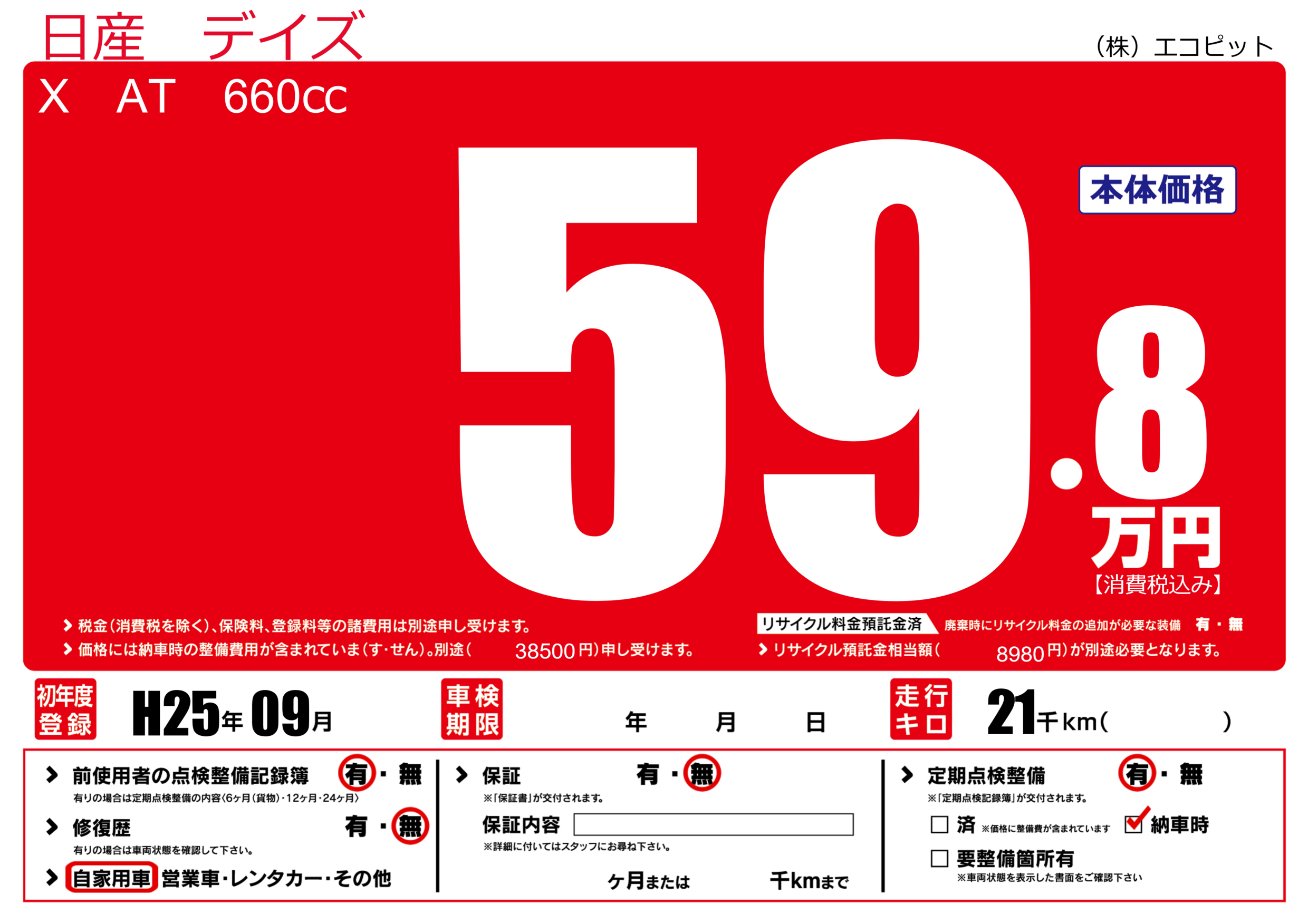 | 車名 | 日産 デイズ | グレード ミッション 排気量 |