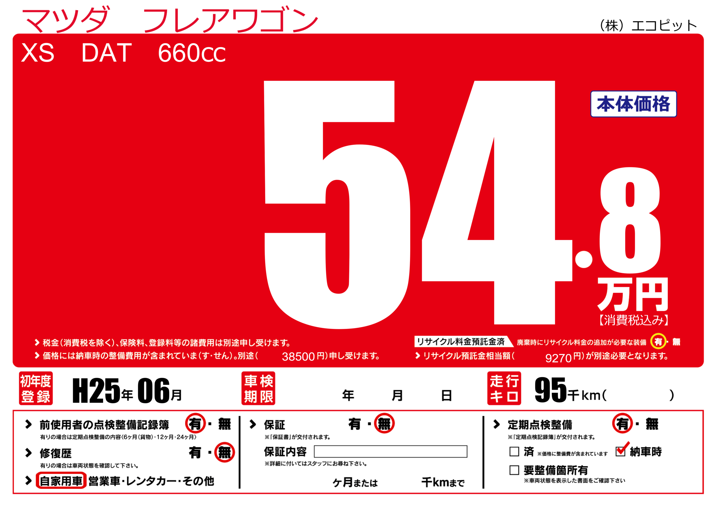 | 走行キロ | 9.5万km | 初年度登録 | H25年06月 |